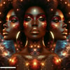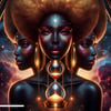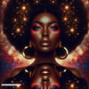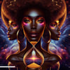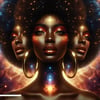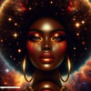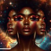 A surreal Art Deco portrait of a divine African American goddess, mirrored in cosmic reflection. Her radiant melanin skin glows with celestial energy. Her eyes shimmer with stardust-like gold, and her ultra-glam makeup features ruby-red and gold tones. A fusion of Afrofuturism, celestial mysticism, and Art Deco.