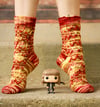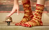 The Ascendio socks, worked from the toe up, use 2 complementary colors and slipped stitches to create an allover stair step design inspired by Hogwarts’ magical, moving staircases. As the 2 colors blend together in spots, the steps seem to disappear and reappear. Knit them in your house colors and wear them out on the Quidditch pitch or just to lounge around the common room—100% Hermione approved!
