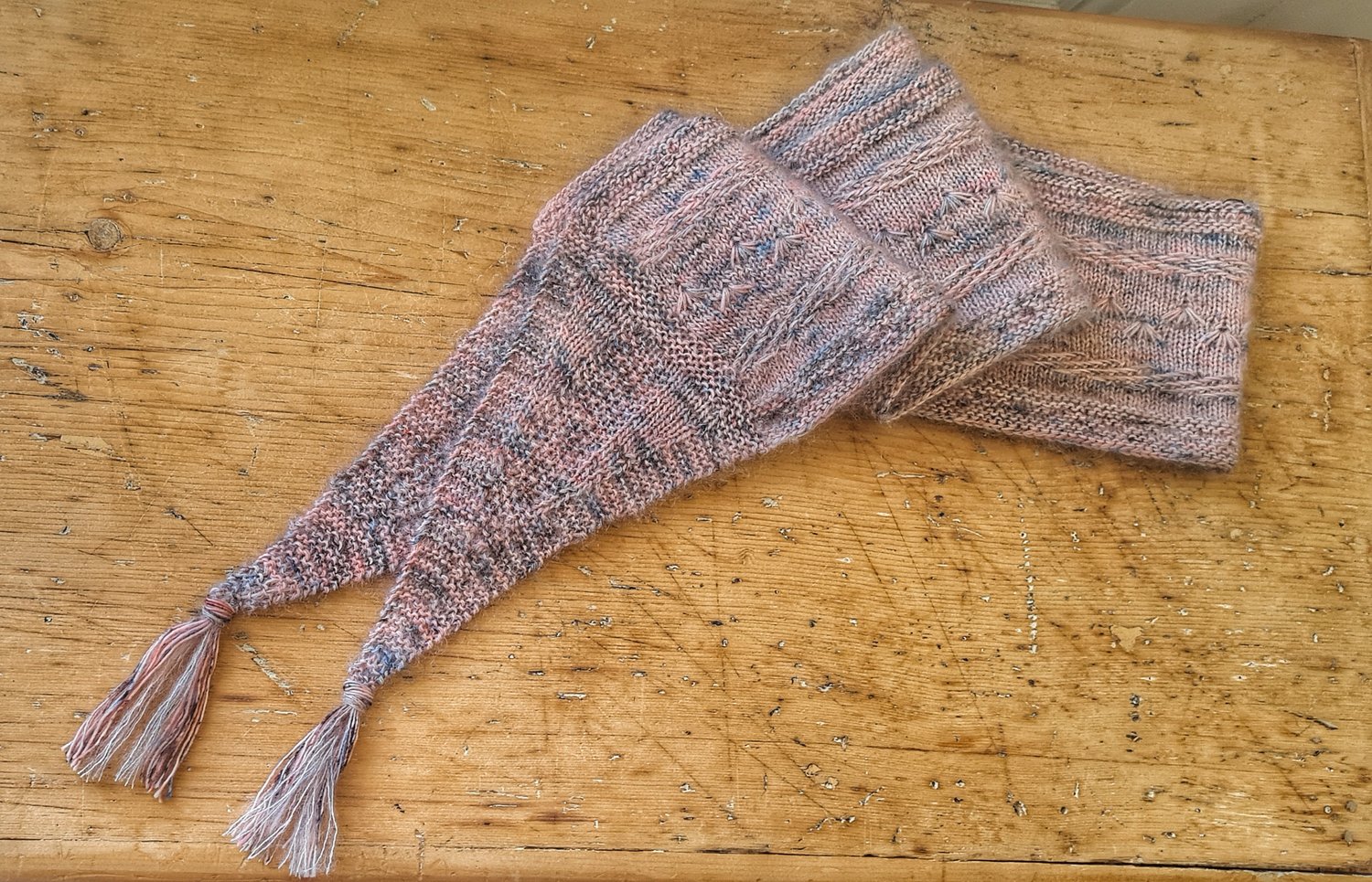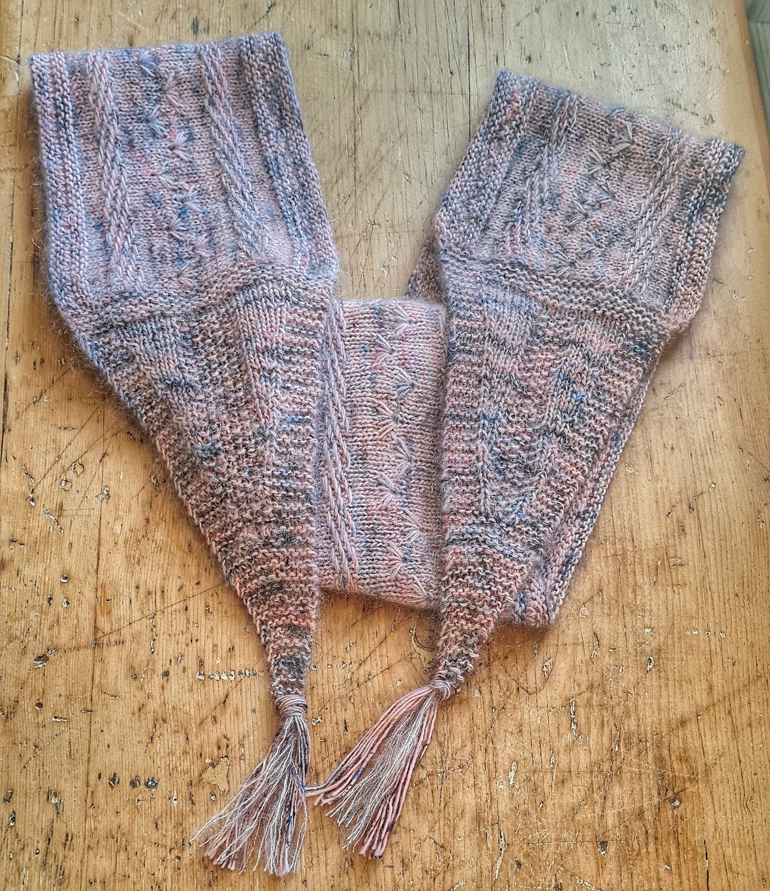 The body of the scarf is knitted sideways, as a long rectangle. The ends are then added and finished with tassels. It features simple but stylish stitch patterns which have video assistance.