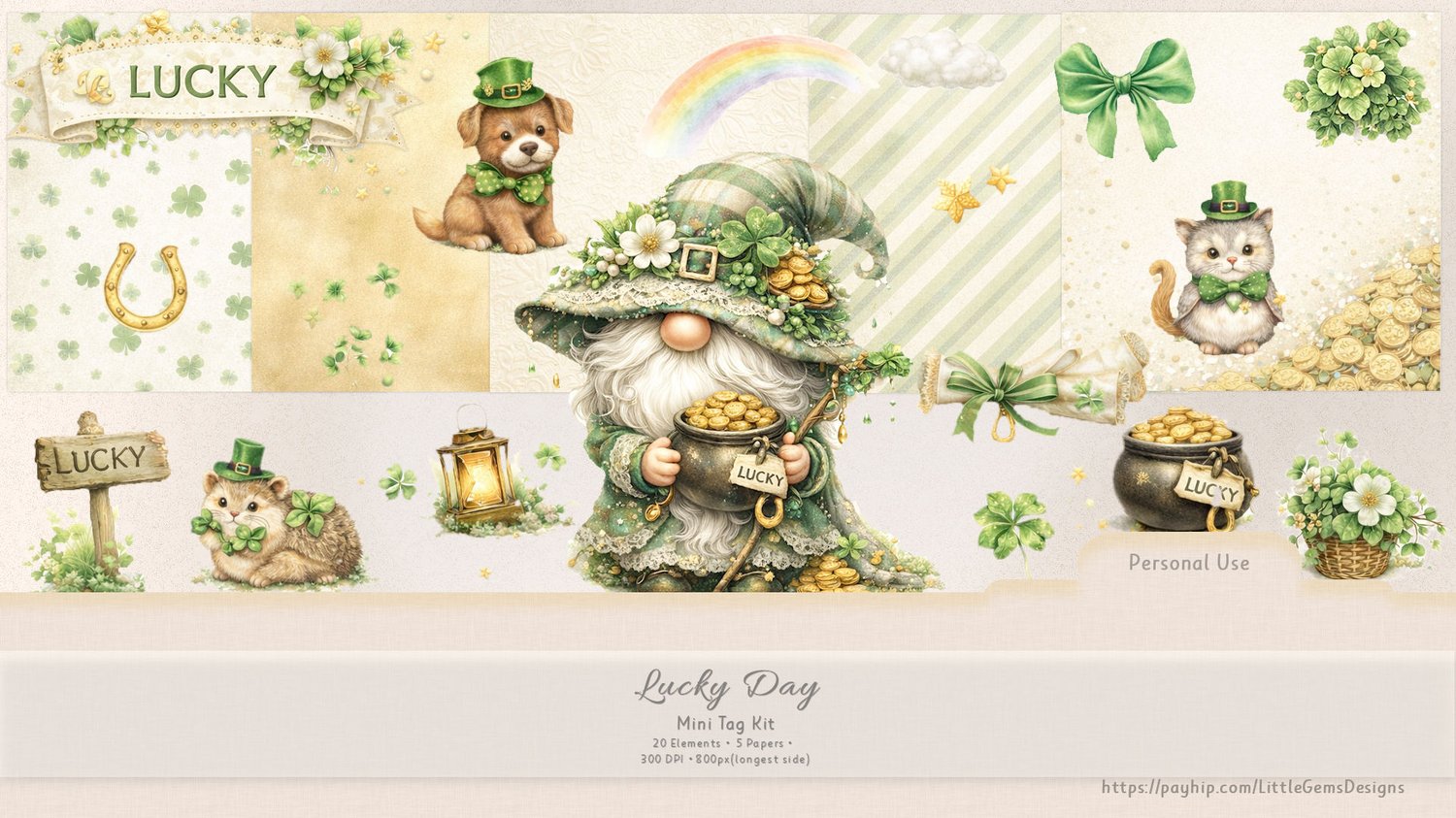 This set includes beautifully detailed elements and coordinating papers featuring a whimsical lucky gnome theme with gentle greens, gold accents, and delicate florals. Perfect for junk journals, digital scrapbooking, tag making, card design, and other personal crafting projects.
