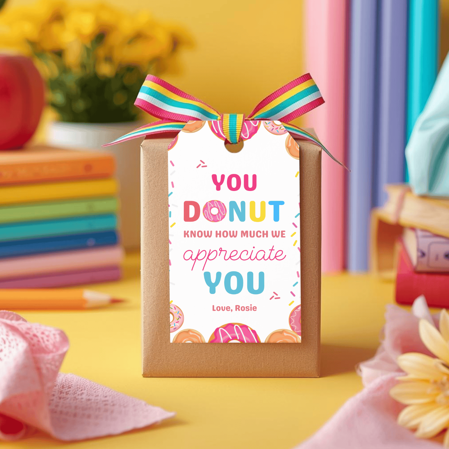 These printable teacher appreciation tags feature the message “You donut know how much we appreciate you” with colorful donut illustrations surrounding the tag, playful sprinkles along the sides, and bright, cheerful text. A perfect finishing touch for donut-themed gifts, treat bags, or sweet surprises during Teacher Appreciation Week.