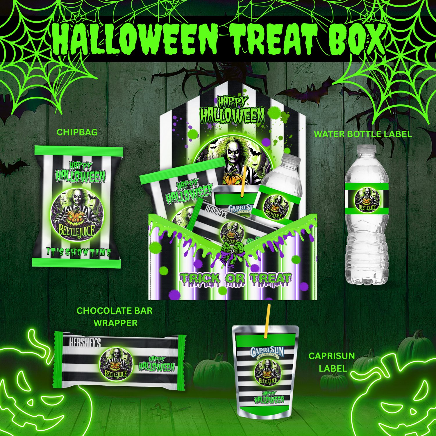 It’s showtime! Our Beetlejuice Theme Halloween Treat Box includes spooky party must-haves — a chip bag, chocolate wrapper, water bottle label, and Capri Sun pouch — the perfect creepy-cool touch for your Halloween celebration.🕸️✨