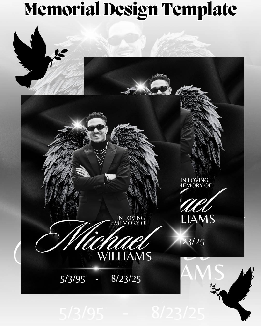 Create a timeless and elegant tribute with this editable memorial design template in classic black, grey, and white tones. Perfect for funerals, memorials, and celebration of life services, this design provides a clean and respectful layout that can be fully personalized to reflect your loved one’s memory.
