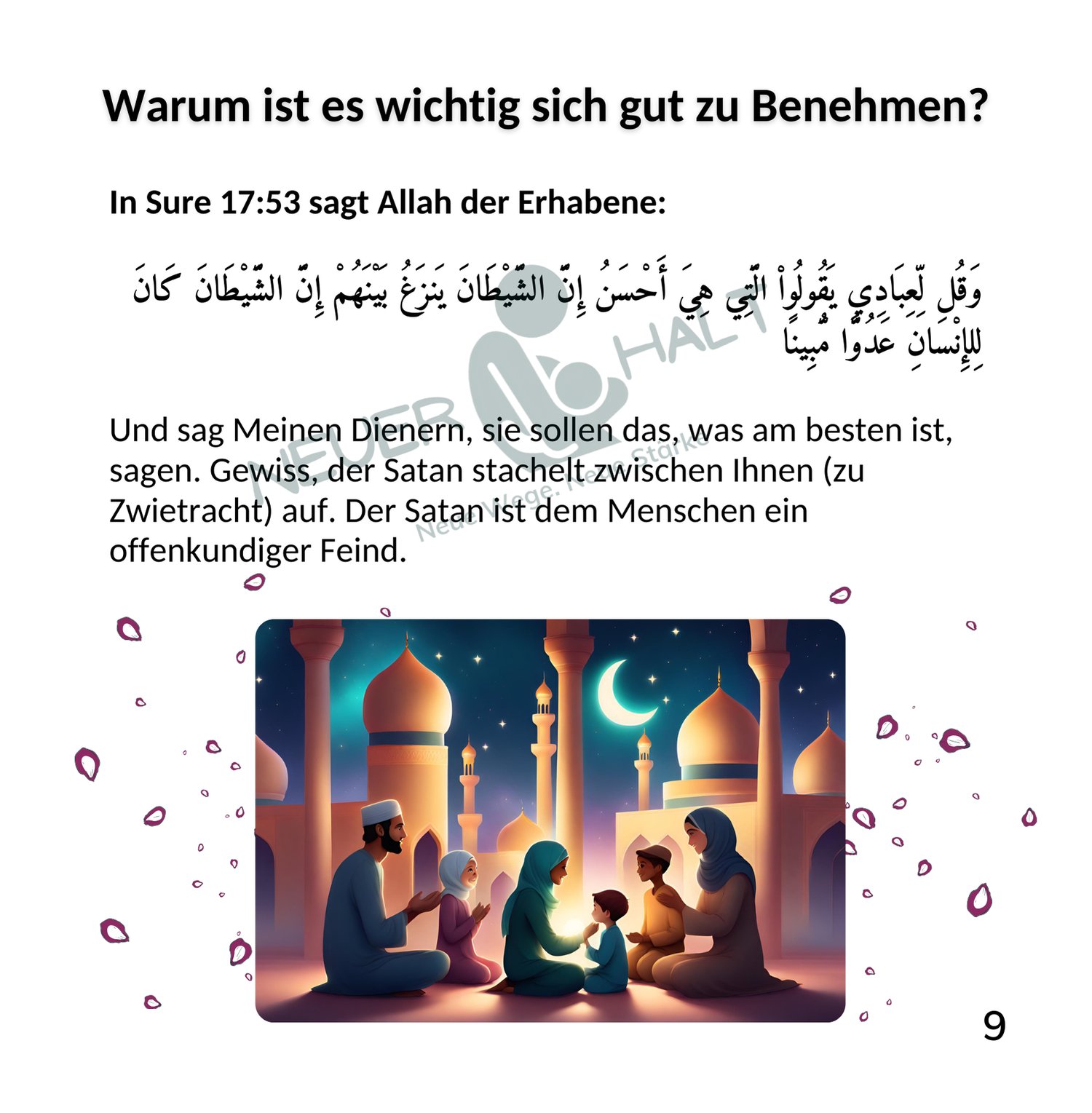 Gutes Benehmen ist wie ein strahlendes Licht, das die Welt um uns herum erhellt. Mit jedem Lächeln, jeder guten Tat und jeder respektvollen Geste bringen wir Freude in unsere Umgebung und zeigen die Schönheit des Islam. 🌿💛
