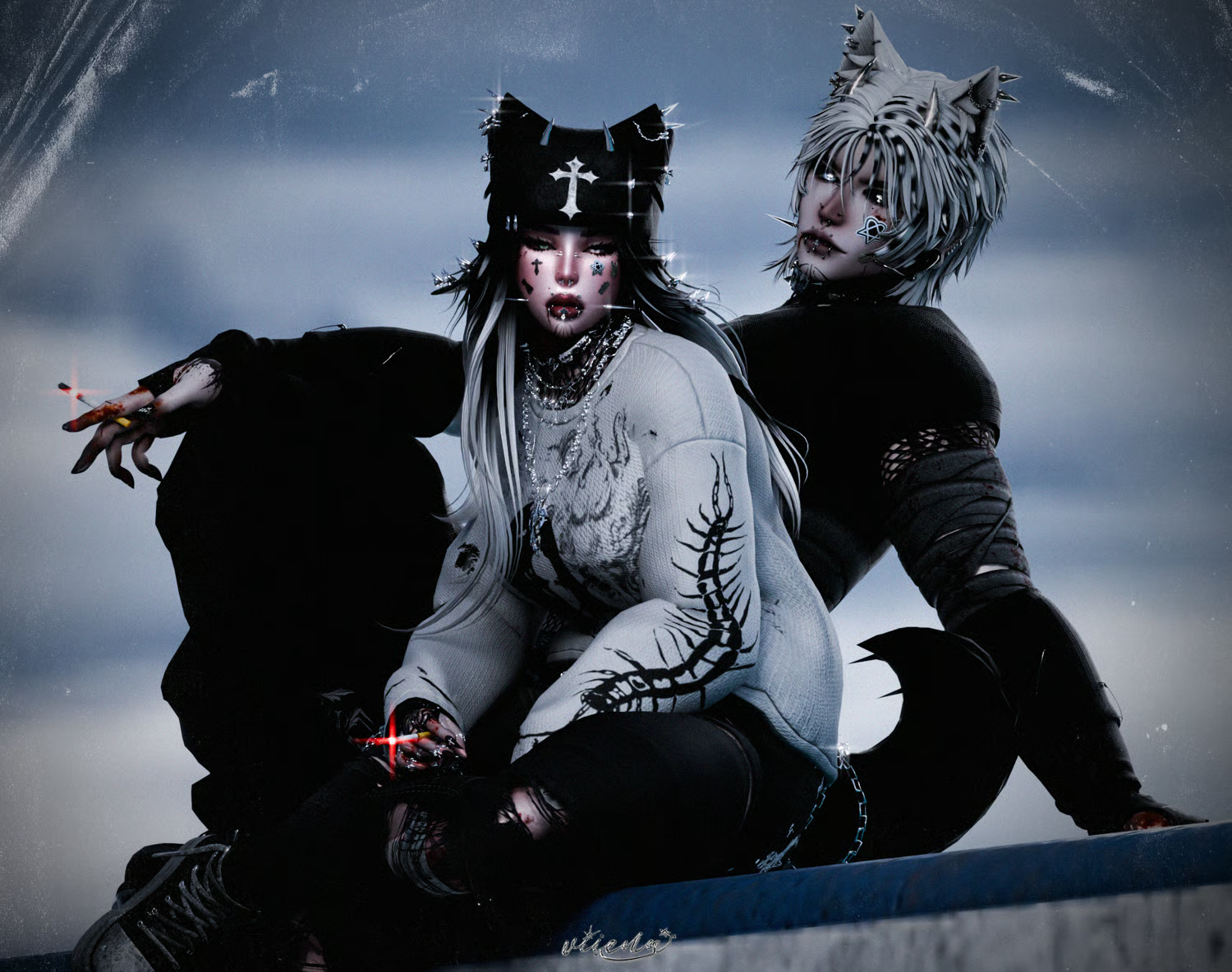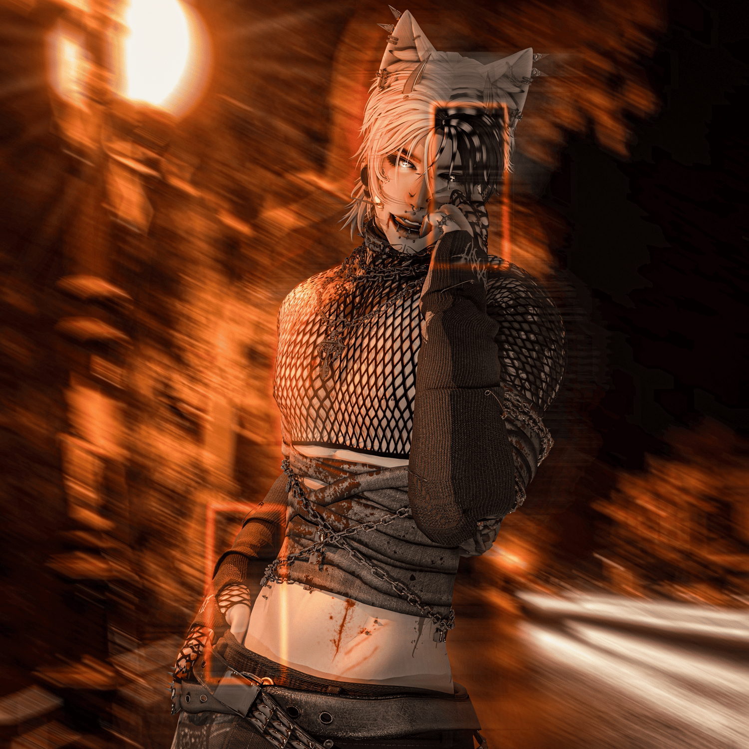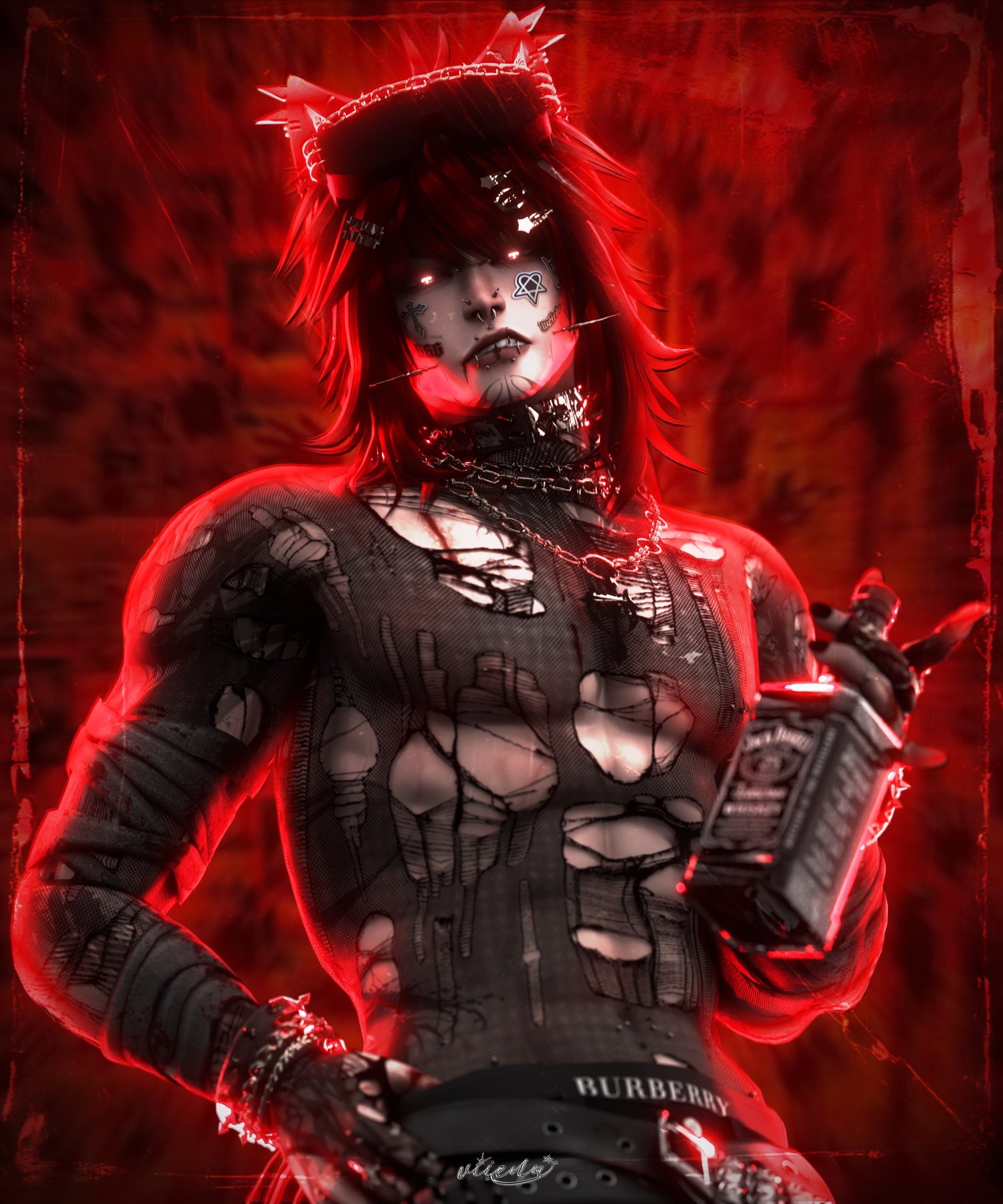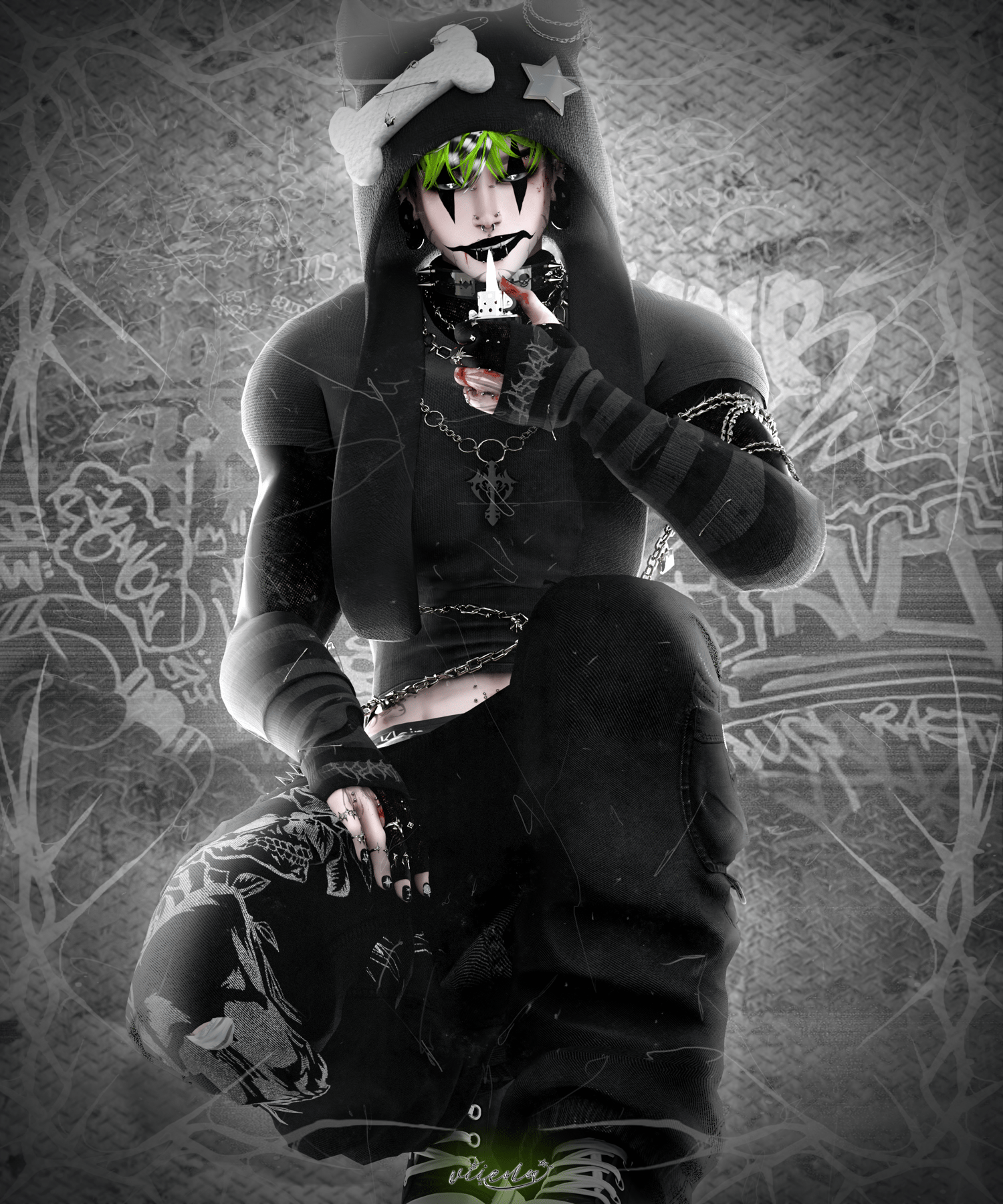 Torn Sweater, Spiked Tank, Compressed Shirt, Long Sleeve Crop, Hoodie, Collared Sweater, Sweats, Boots, Platform Sneakers, Devil Bone Hat, Cap, Ushanka Hat, Earmuffs, Ears, Horns, Shades, Glasses, Arm Warmers, Knee Tape, Choker, Necklaces, Hair Clips, Piercings, Earrings are made by me