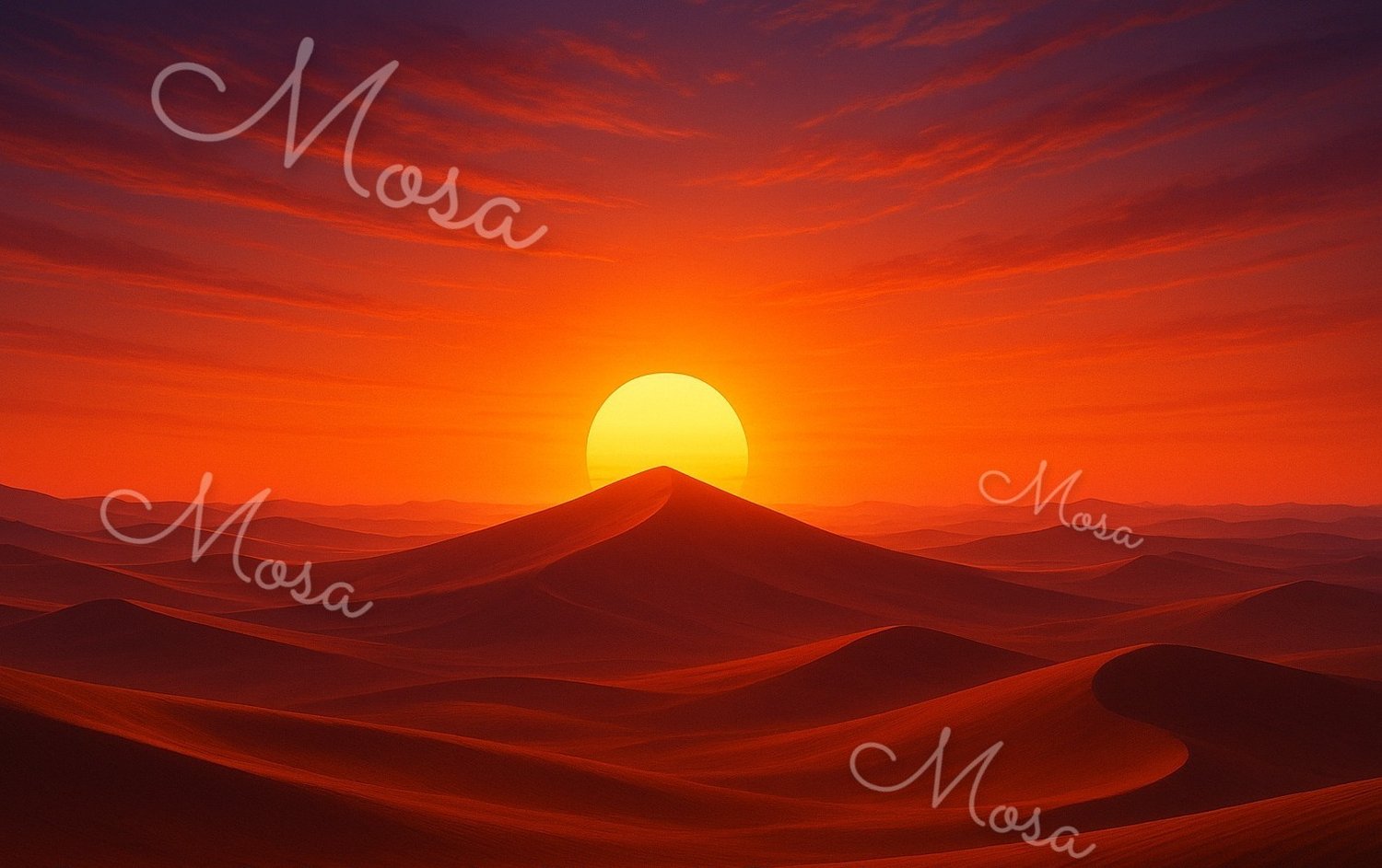 An artistic painting of the sun setting over the desert.