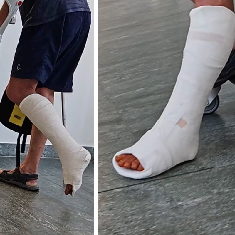 He then waits in front of the cast room to be picked up. During this time we can take a closer look at his casted foot.
