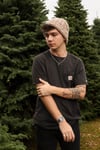 Hat is worked in 1 piece, bottom up, from brim through crown decrease, in the round. Center of crown is then seamed across the top in a variation of the kitchener stitch.