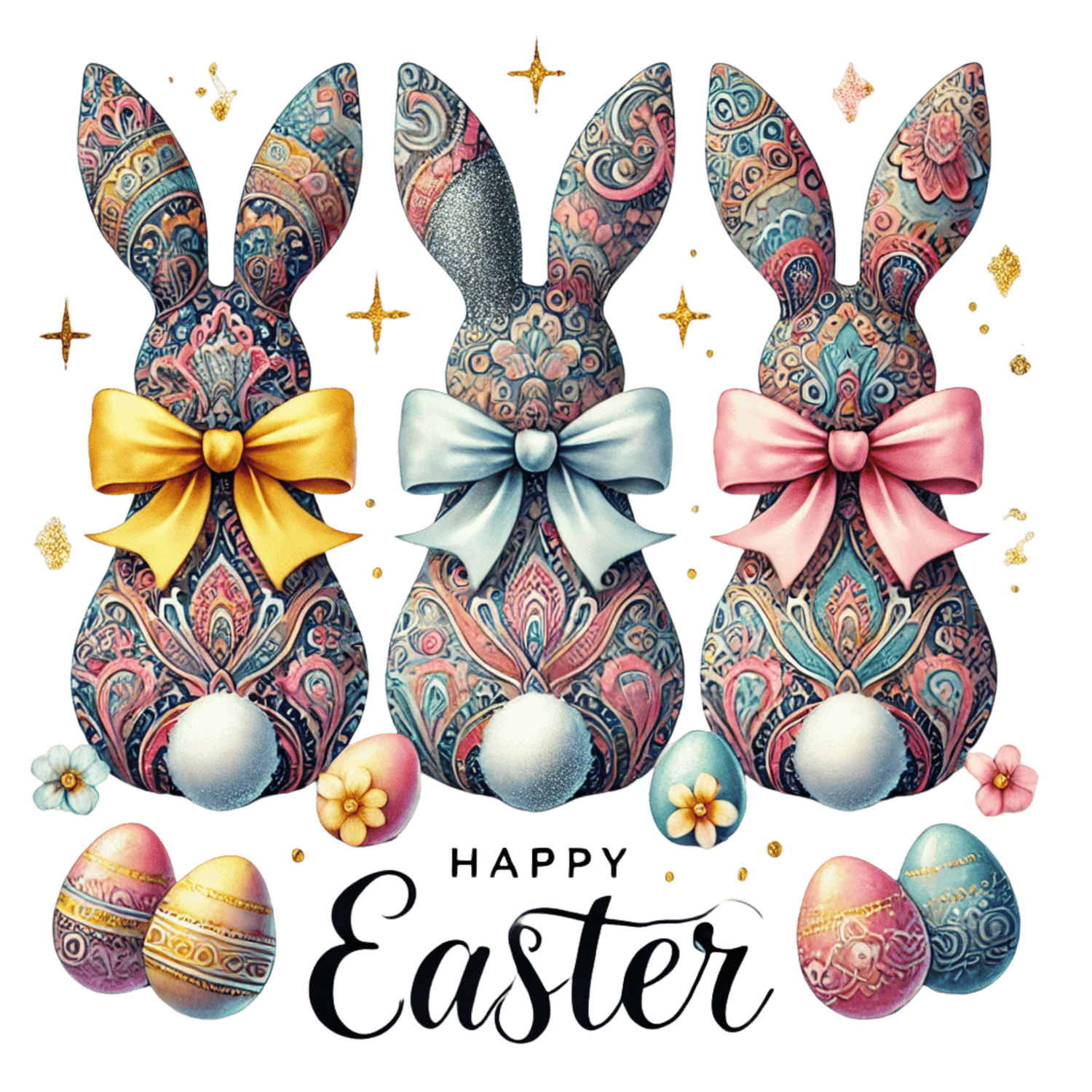 This beautifully detailed Easter Bunny PNG bundle includes 5 unique designs featuring glamorous, paisley-patterned bunnies dressed in pastel bows with sparkly eggs, glitter accents, and whimsical floral touches.