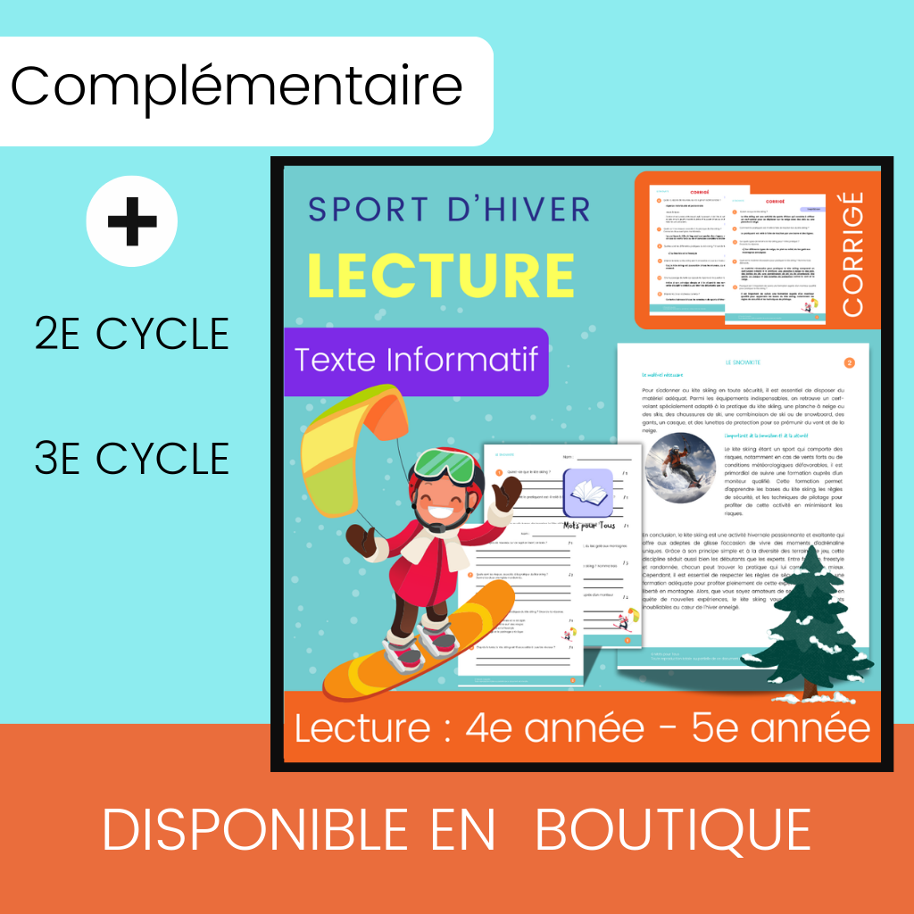 Pour une séquence lecture–écriture complète autour des sports d’hiver, combinez cette situation d’écriture avec la compréhension de lecture Snowkite (2e cycle).