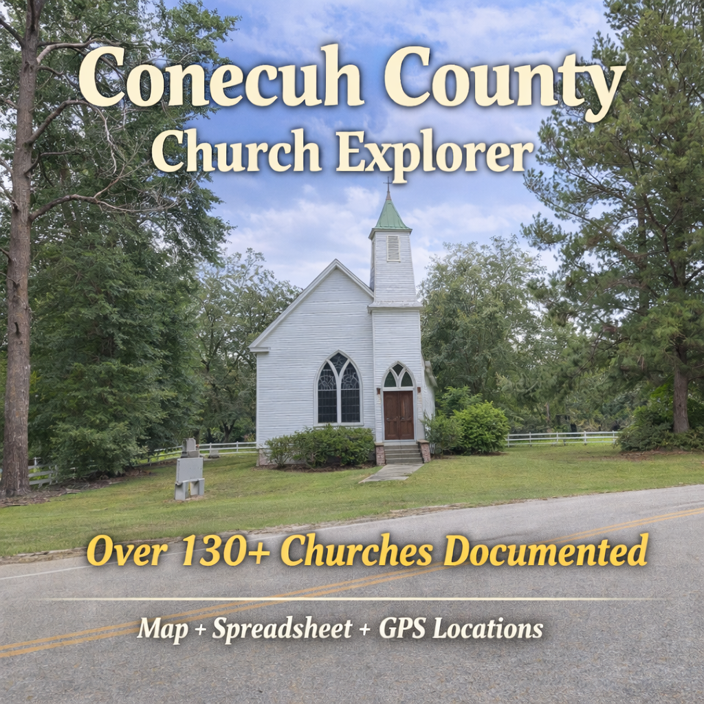 Explore over 130 documented churches across Conecuh County, Alabama.