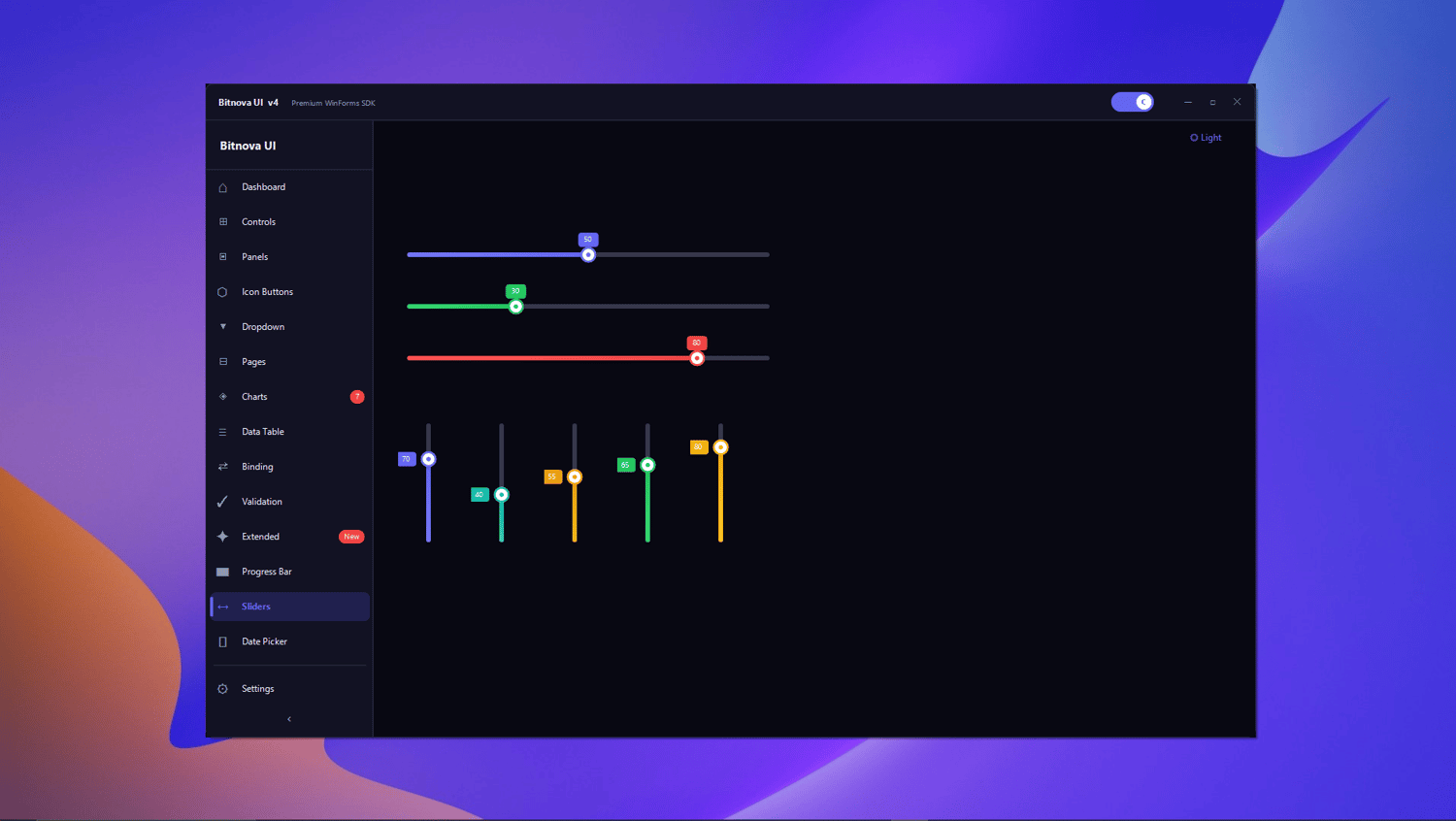 - 30+ custom controls — Buttons, TextBoxes, ComboBoxes, DataGridView, Sidebar, Sliders, Progress Bars, Gauges, Date Pickers, Charts, Chips, Toasts, Cards, Widgets, and more