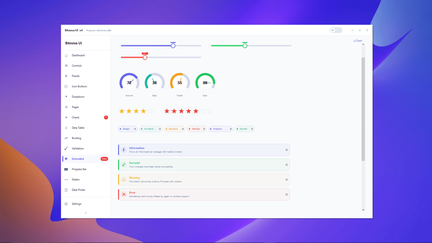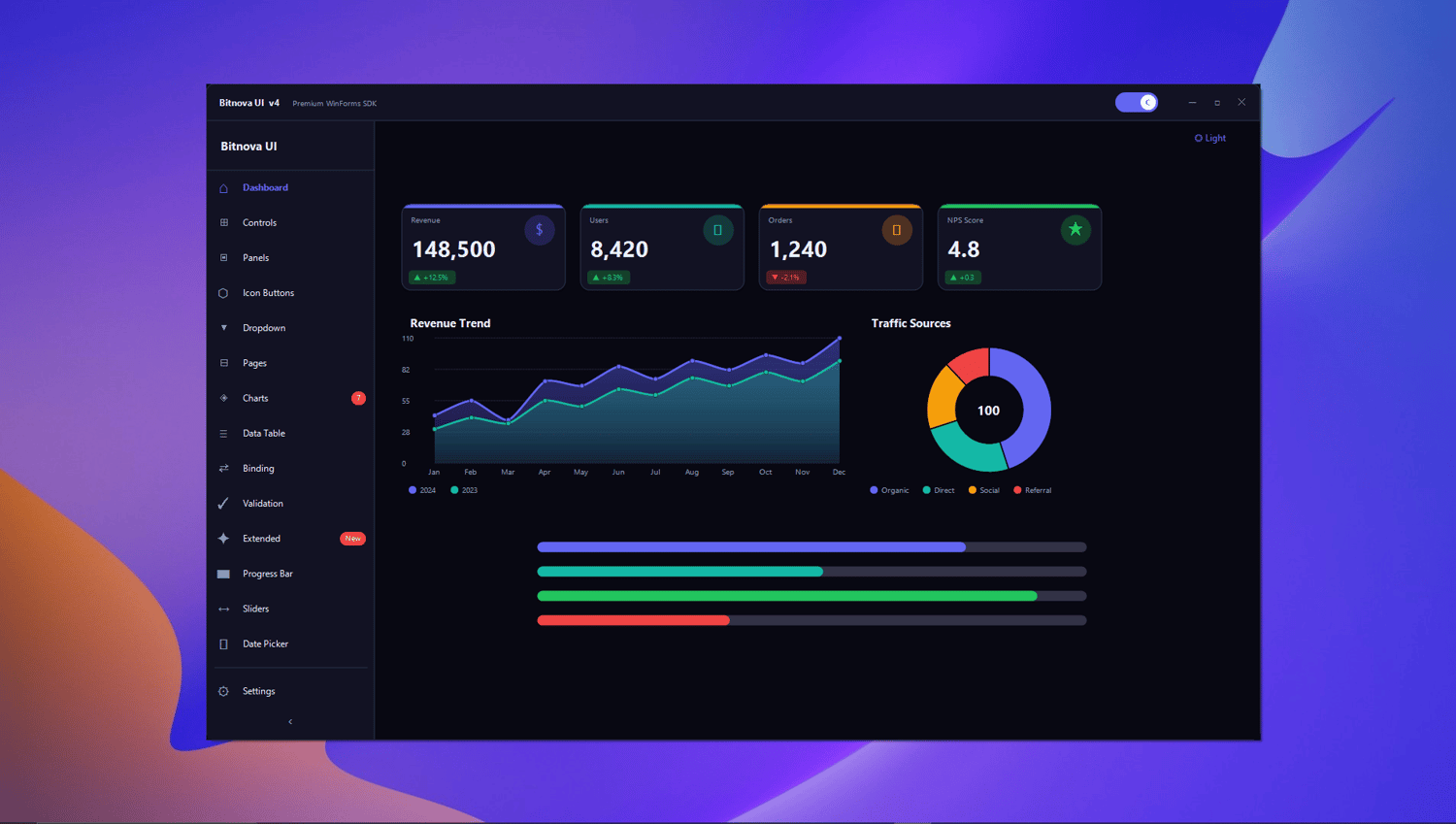 Bitnova UI SDK is a premium WinForms component library that gives .NET developers beautifully designed, production-ready controls right out of the box. Whether you're building internal tools, client-facing desktop software, or a SaaS product with a Windows frontend, Bitnova makes it look like it was designed by a professional UI team.