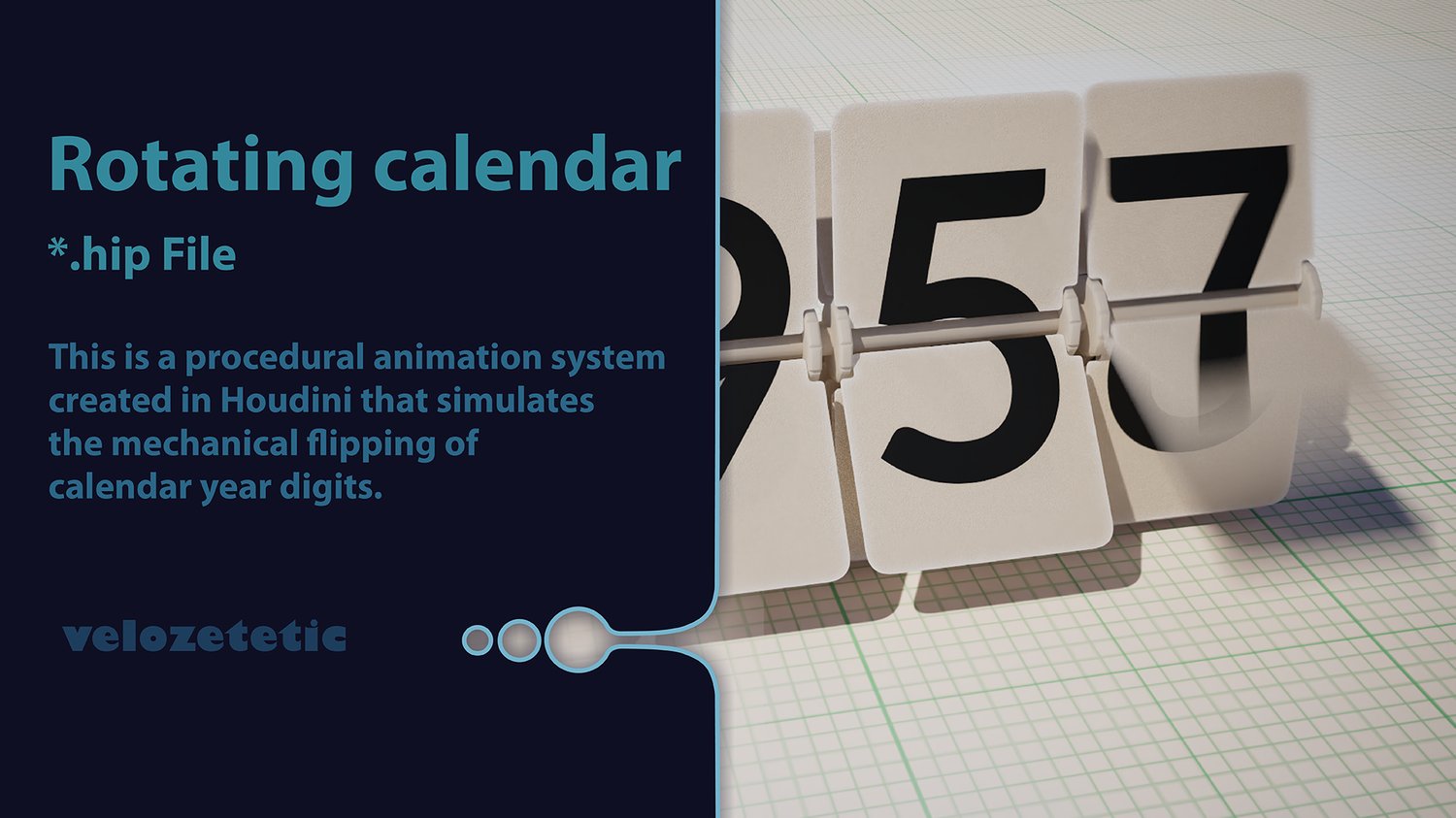 The Rotating Calendar is a procedural animation system created in Houdini that simulates the mechanical flipping of calendar digits, similar to those found in vintage flip clocks or mechanical date displays. The project demonstrates advanced animation techniques using quaternion rotations and attribute manipulation to create physically believable motion.