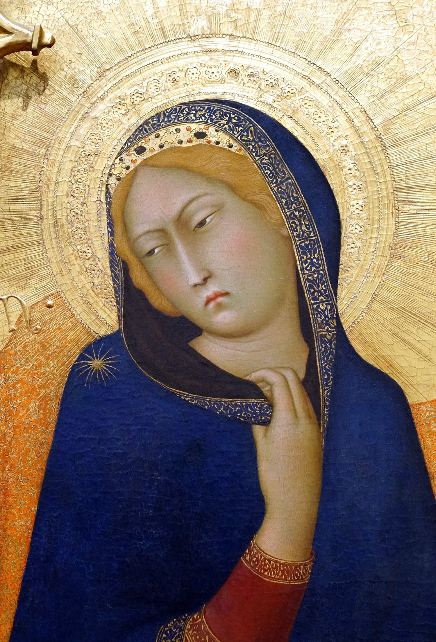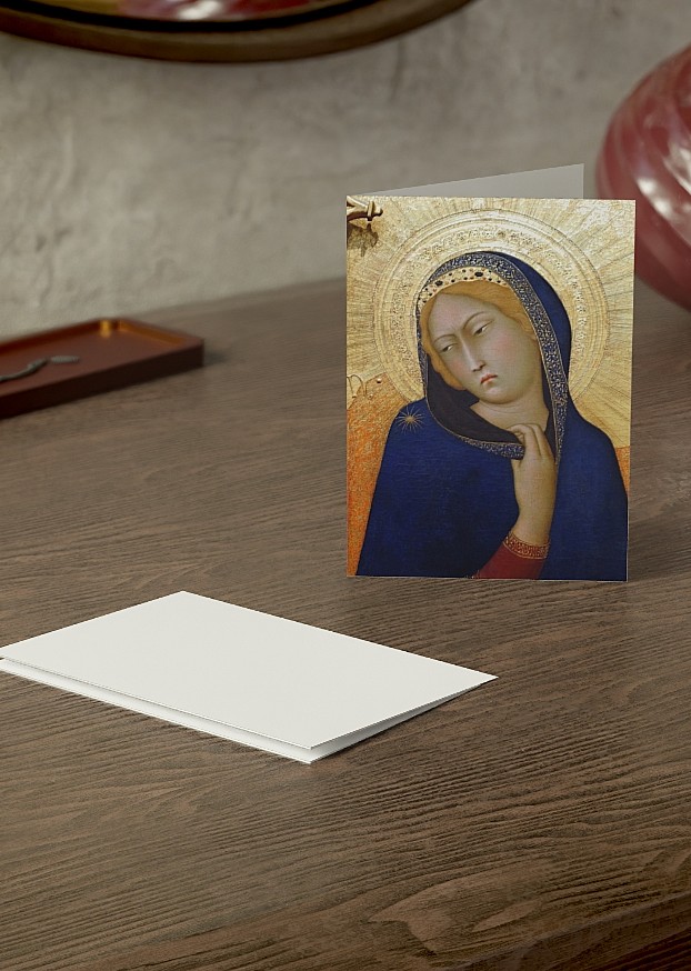 This lovely card features a detail from Simone Martini’s famous Annunciation (1331), one of the great masterpieces of Sienese Gothic painting. The Virgin’s serene, contemplative expression and deep blue mantle convey both majesty and tenderness, framed by the artist’s luminous gold ground. Perfect for Christmas, feast days, or personal correspondence inspired by sacred beauty.