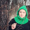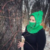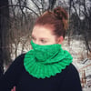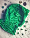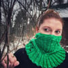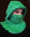 For this design, I wanted to knit in both Nott’s knotty past and her fascinating current occupation. Thus, the cowl is thickly ribbed and cabled to represent both the tragedies of Nott’s former life as well as the strips of cloth she used to cover her green goblin skin so she could go about unnoticed. The hood represents Nott’s stealthy present as the Mighty Nein’s rogue. The Critical Sheep Dragon Lord colorway used on this design was the perfect match for our favorite goblin. And, in addition to looking roguishly stylish, this wonderful yarn makes this hooded cowl extra cozy to wear!