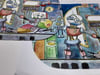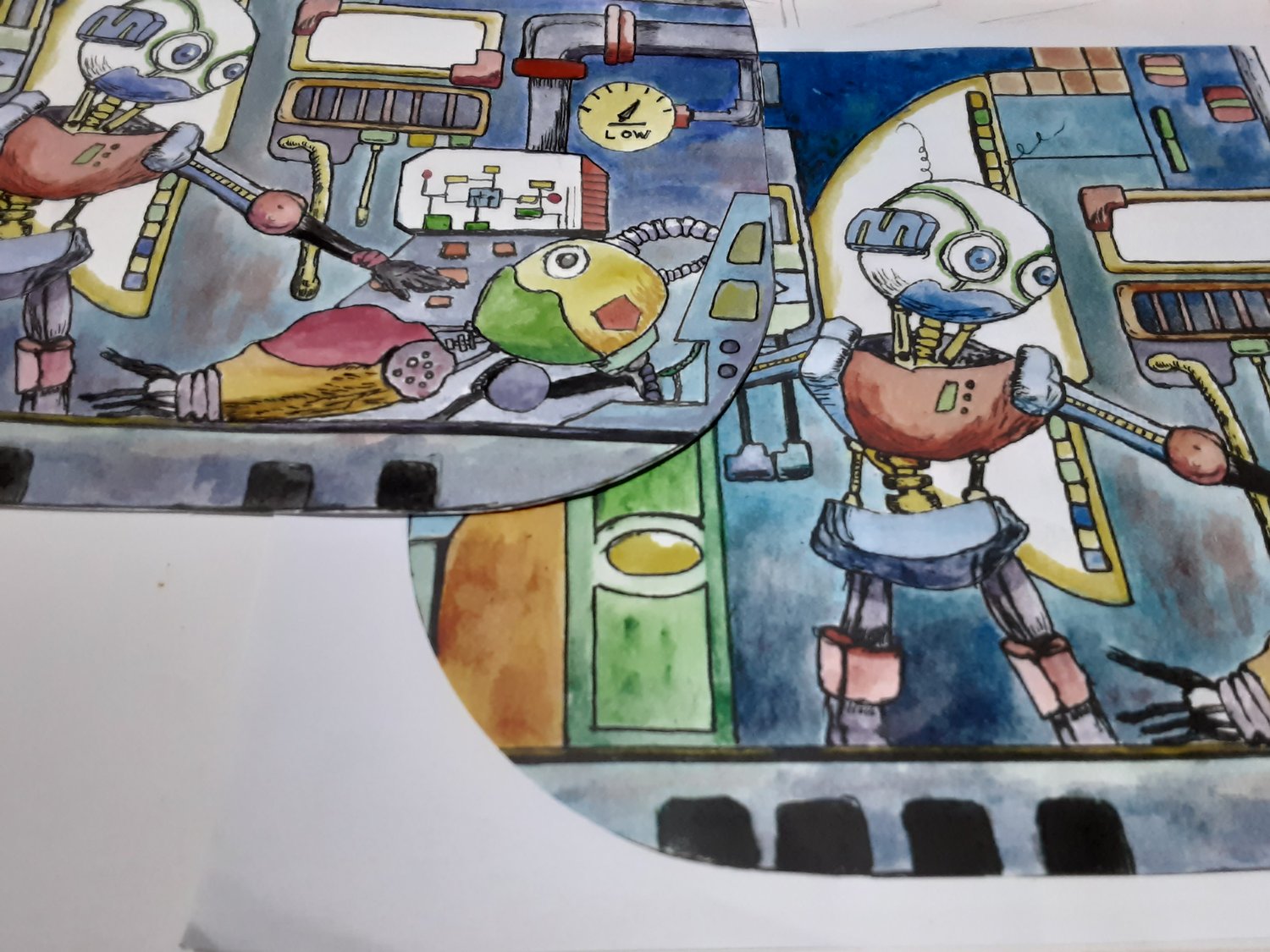 Cartoonish illustration of 2 robots in a laboratory or workshop. The process of making the artwork starts with drawing on a sketchbook, inking, then scanning. I printed it on a larger paper then applied watercolo;.reinked again to darken the original linework since the watercolor can fade it.