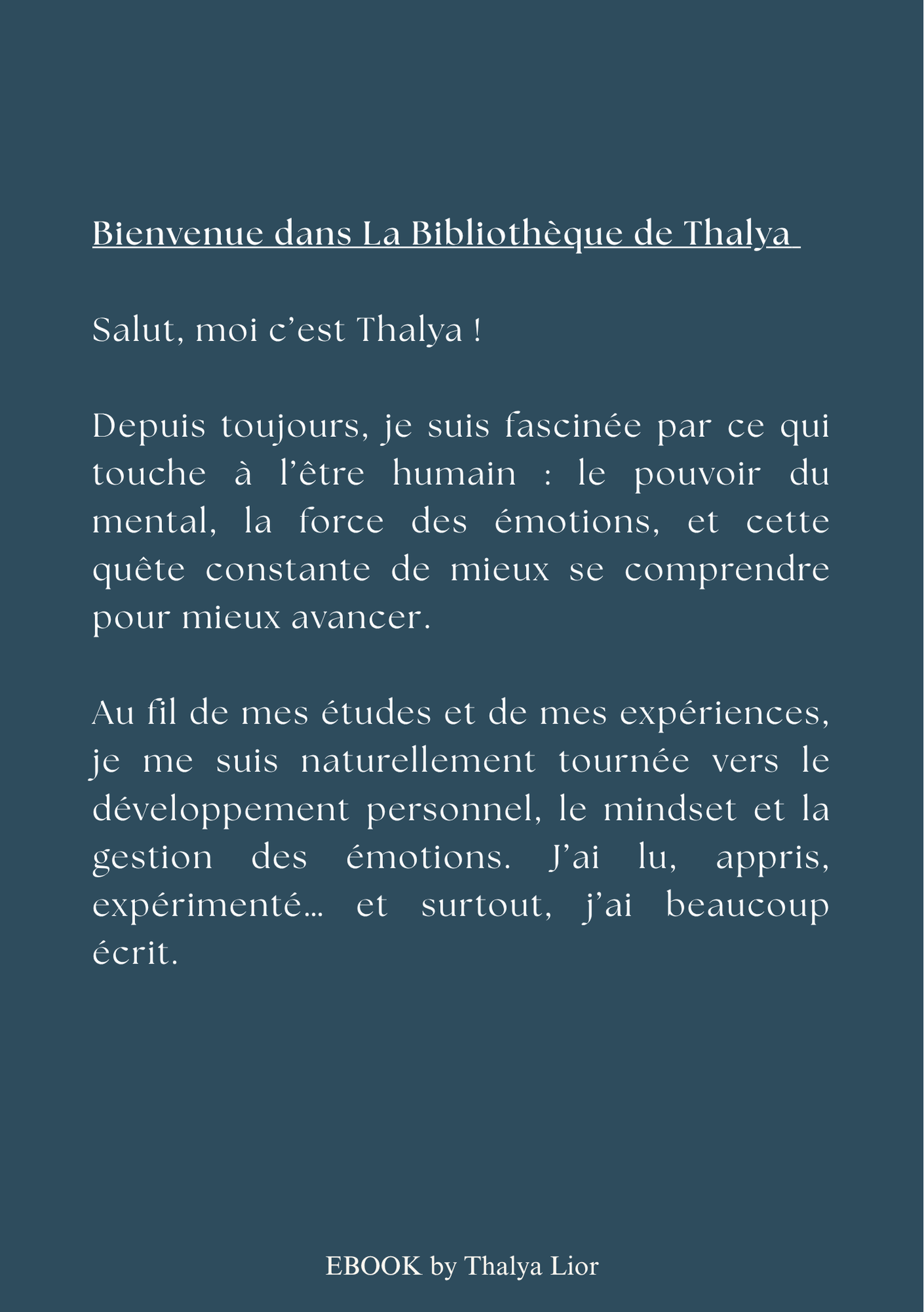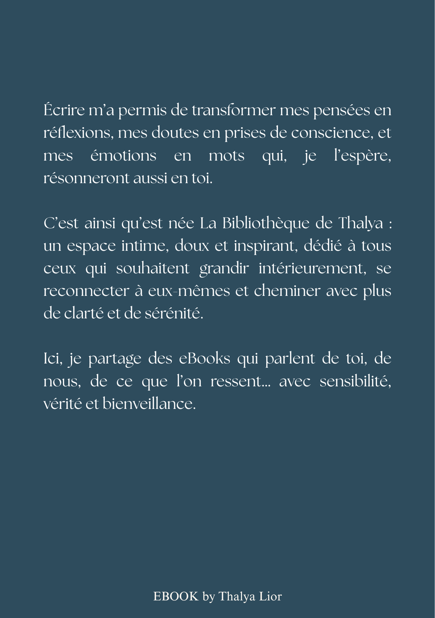 Créatrice de “La Bibliothèque de Thalya”, un espace littéraire pour explorer les émotions, le développement personnel et l’introspection avec douceur et profondeur.