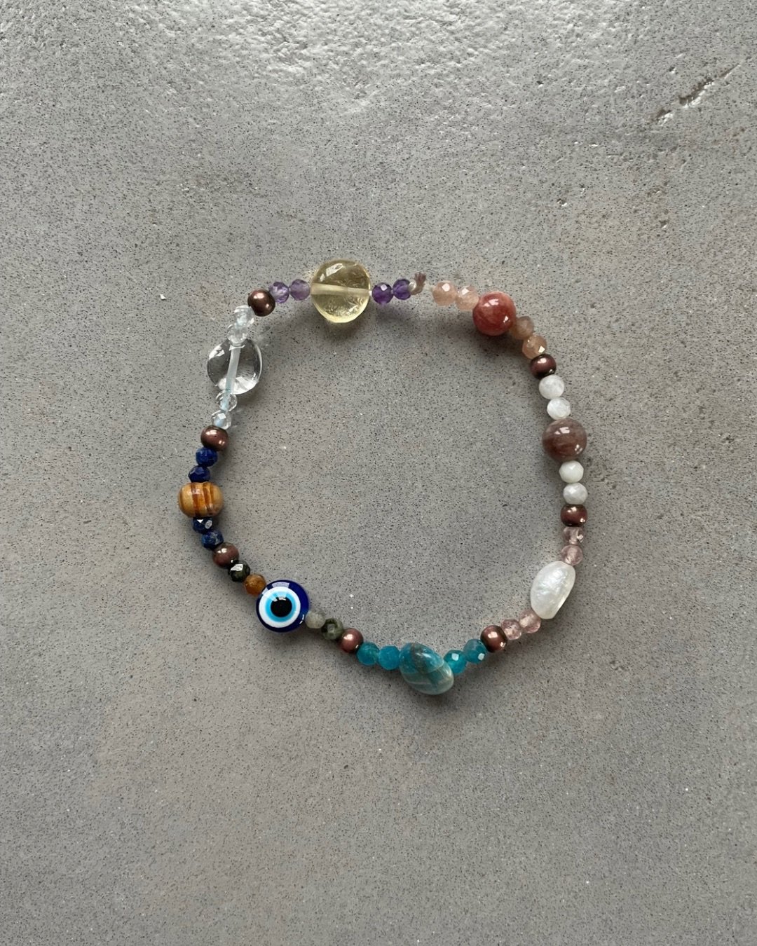 Zur Reinigung gehst du mit dem Armband oder Fußkettchen duschen oder hältst es unter fließendes Wasser. Alternativ kannst du es auch über Nacht auf eine Selenitplatte legen.