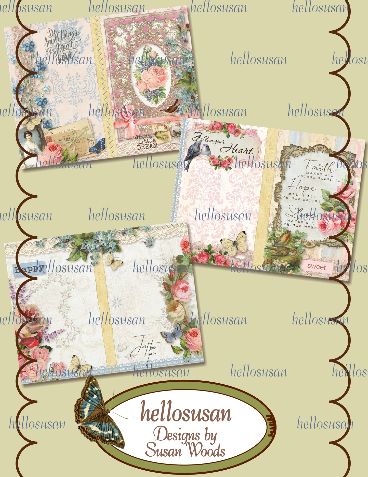 Create your own Love Always junk journal! Would also be great for Valentine projects. This kit features shades of teal, pink, blue, red and cream, which includes vintage-style designs with a variety of roses, cottage flowers, butterflies, birds, ribbons, romantic vintage woman, vintage love letters, vintage wallpaper backgrounds and vintage graphic images with script & other design elements. Can be folded to create journal pages. Includes journal pages, journal cards, tags, envelopes, background pages and ephemera. Sentiments about love and inspiration.