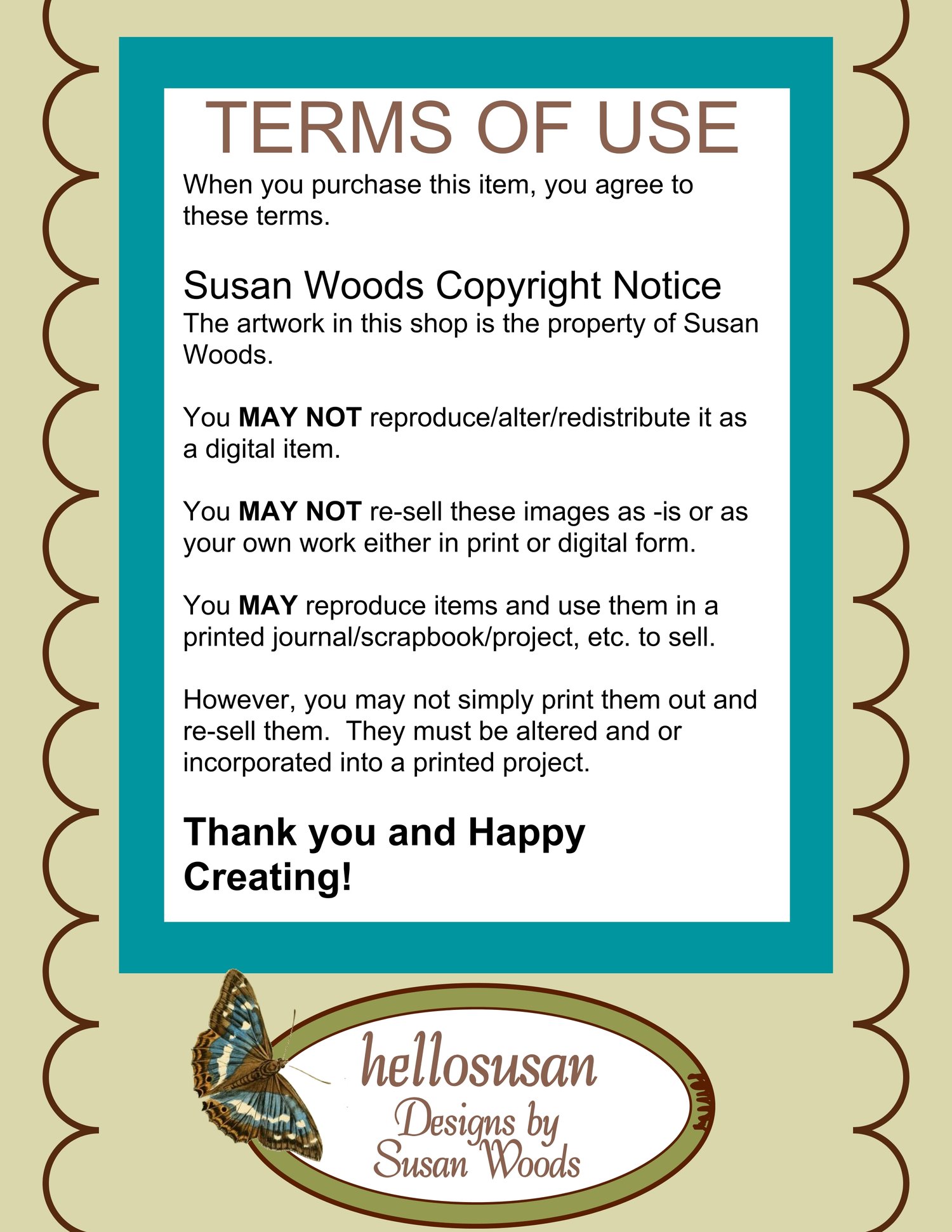 The artwork in this shop is the property of SUSAN WOODS. You MAY NOT reproduce it for commercial use as a physical item. You may NOT sell it as a digital item (a file or in a digital collage, etc.). You MAY NOT re-sell these images as-is or as your own work either in print or digital form.