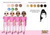 three different skin tones, three eye colours and 6 hair colours