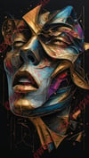 This piece features a fragmented metallic face composed of interlocking gold, bronze, and blue‑steel elements.