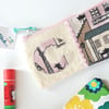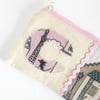 Applique made with corresponding printed fabric is embroidered on a beige surface, making the letter "c" more outstanding.