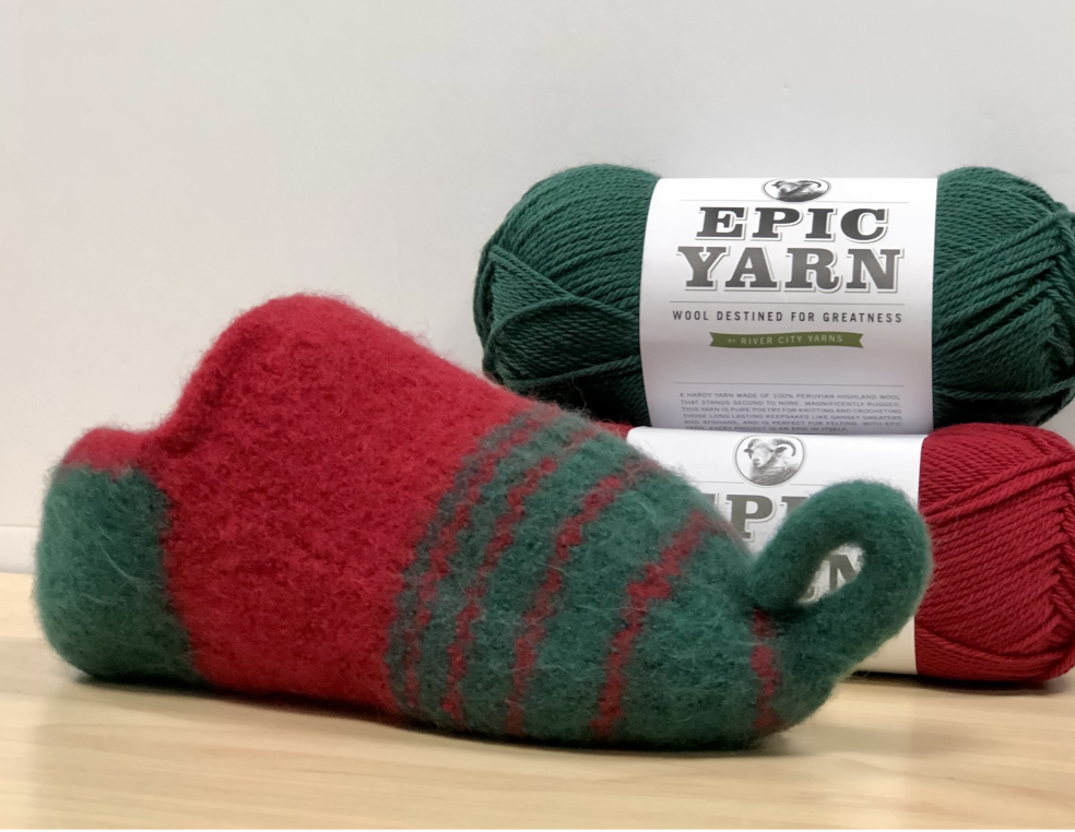 This addendum is for the "Epic Elf" version. Using our Fuzzy Foot Socks pattern, we modified the toe to create a version of our felted slippers to warm the soles of friends and family. The underside of the toe is curved up with a little short row shaping and a six stitch I-cord finishes off the slipper with a fun curl (and a great way to “hang up your slippers” for the night.)