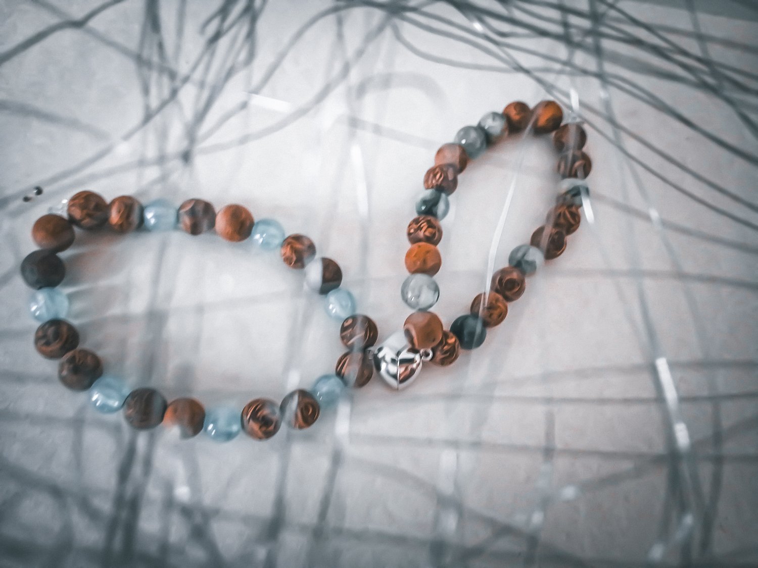 Set of 2 friendship bracelets with silver metallic magnetic heart charm.
