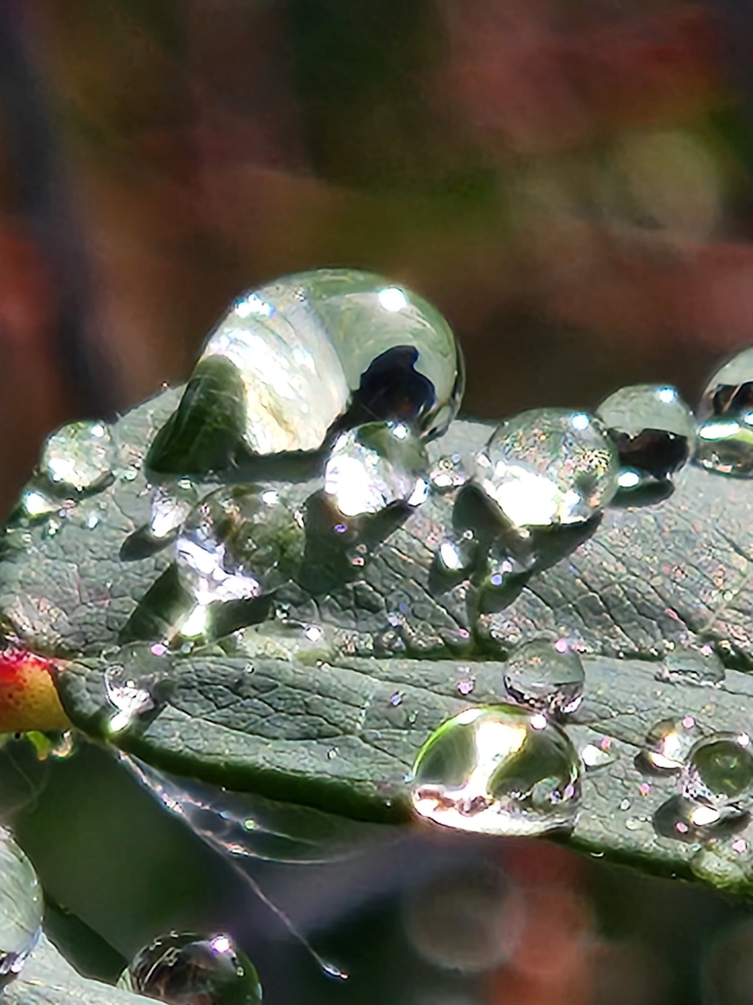 "Dew Drops Galore" was captured after a heavy rain. The group of drops was intriguing. Hope you enjoy!!
