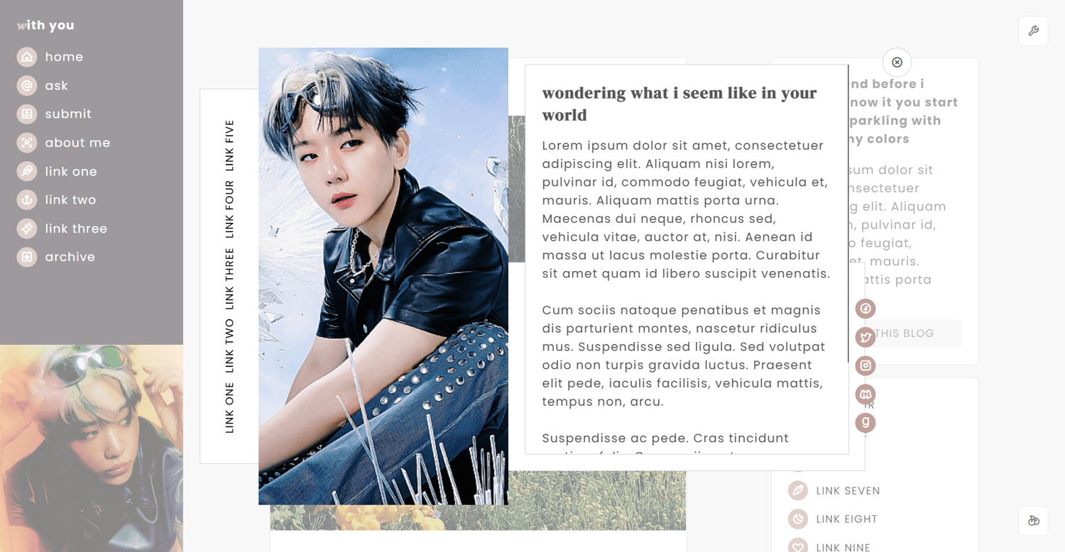 features: 220x250px sidebar image, 50x50px icon image, blog title, blog subtitle, nine custom links, search bar, five extra links, 300x550px about image, about section, socials section, 450px to 540px text posts