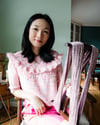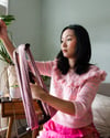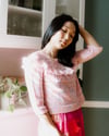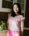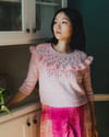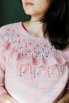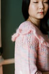 Inspired by the savory whipped cream cheese toppings of Southern California bubble tea drinks in the region that Aimee grew up in, this pullover features delightful tea leaves and yarnover ‘boba’ pearls in the lace yoke, a boxy cropped body, ¾ length sleeves, all topped with a frothy, light-as-air mohair creamy ruffle.