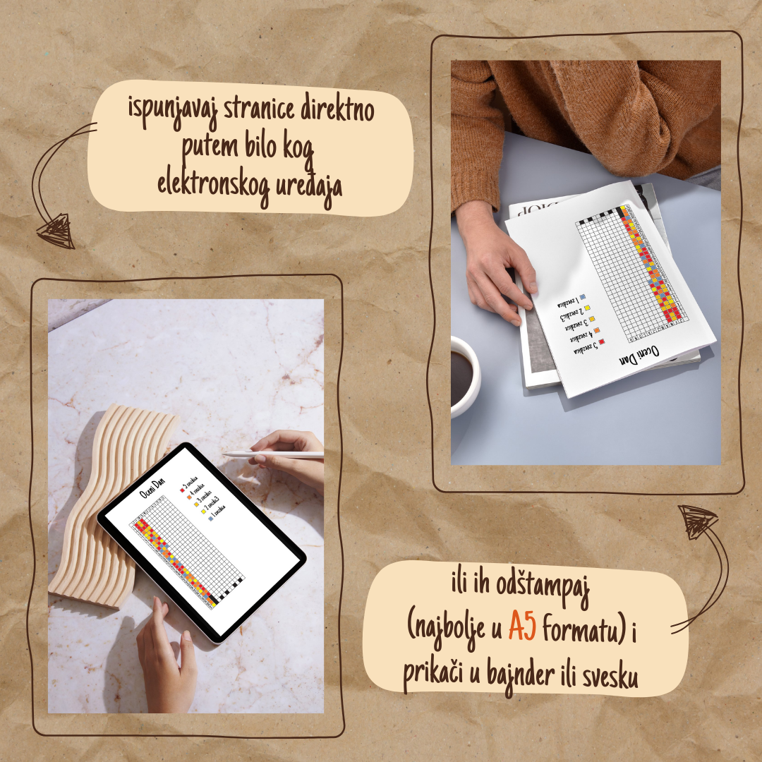 Svaka stranica za dnevnik je dizajnirana da ti omogući da koristiš različite boje za praćenje različitih aspekata svog života, pomažući ti da vizualizuješ svoj napredak i razmišljaš o svojim iskustvima.