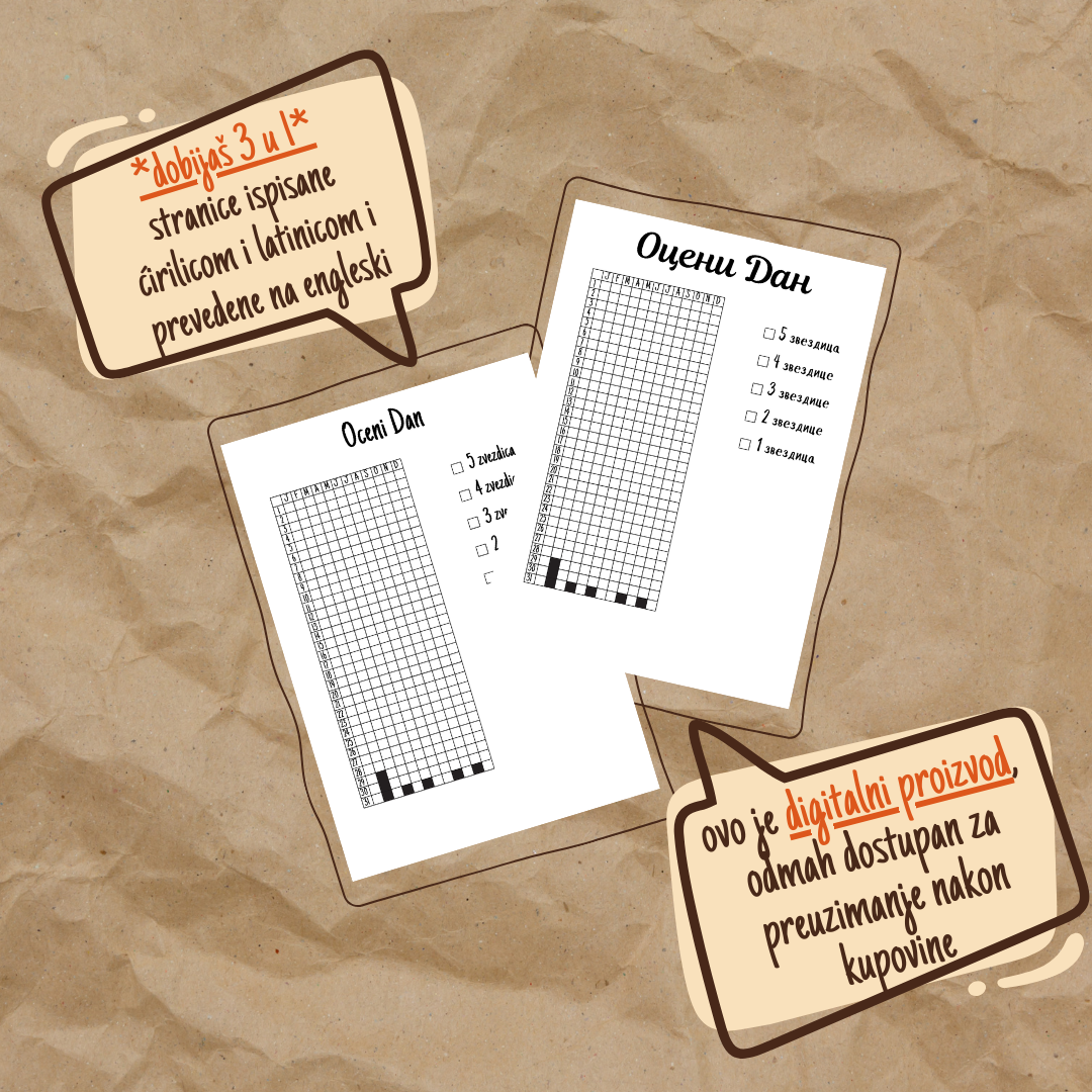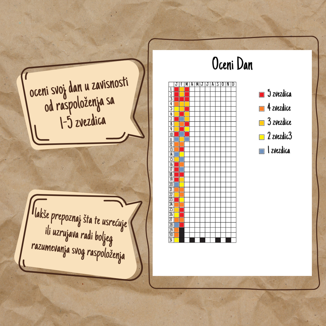 Oceni Dan: Oceni svaki dan od 1 do 5 zvezdica. Koristi različite boje i oslikaj kako se osećaš svaki dan, stvarajući živahan pregled svojih godišnjih emotivnih promena.