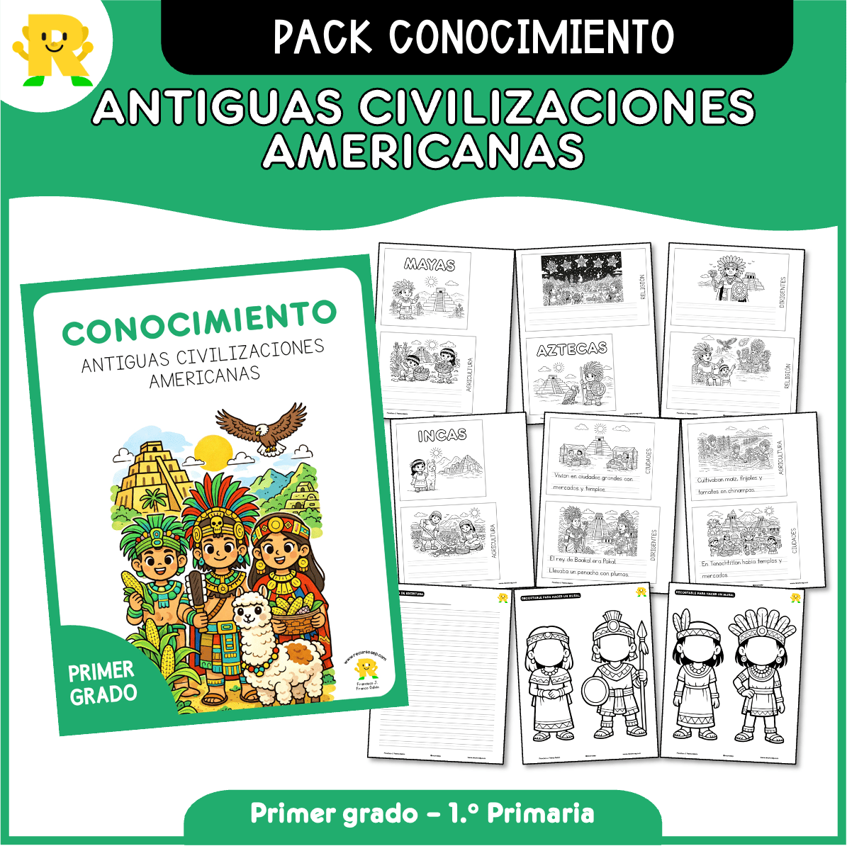 Este pack de actividades está diseñado para que el alumnado de primer grado (6–7 años) descubra y comprenda las civilizaciones antiguas americanas de una forma visual, sencilla y motivadora.