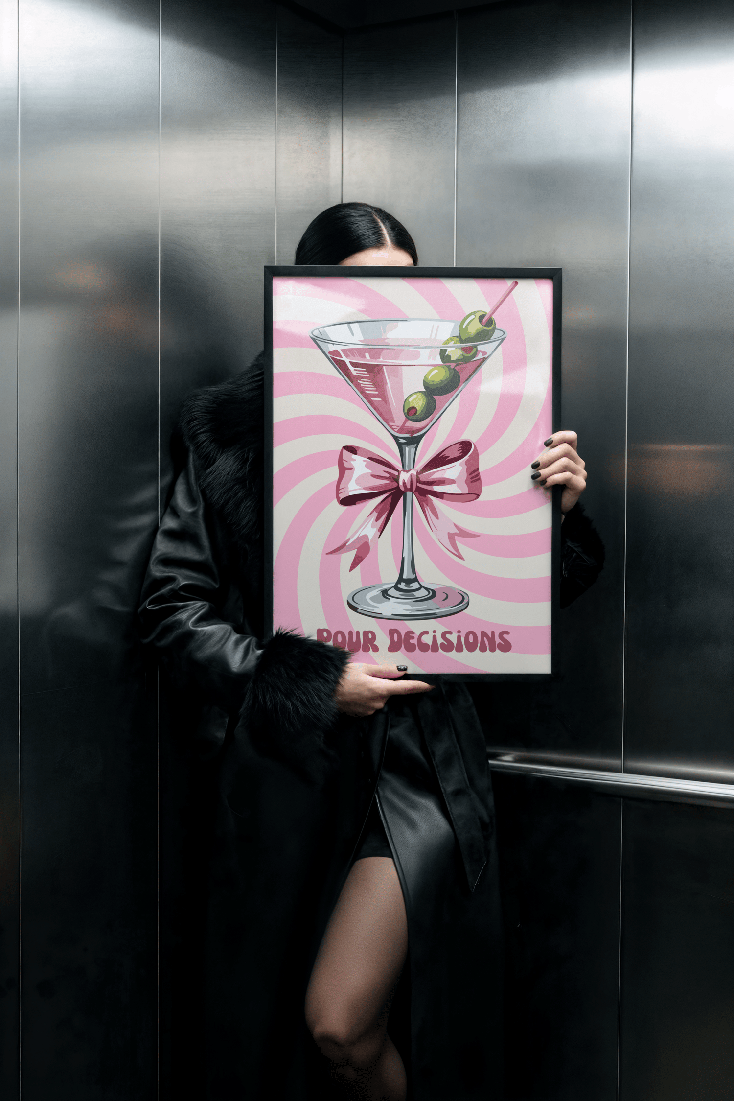 This playful “Pour Decisions” martini illustration blends retro charm with girly glam — featuring a pink cocktail, cute bow detail, and bold swirling background for maximum dopamine decor energy.
