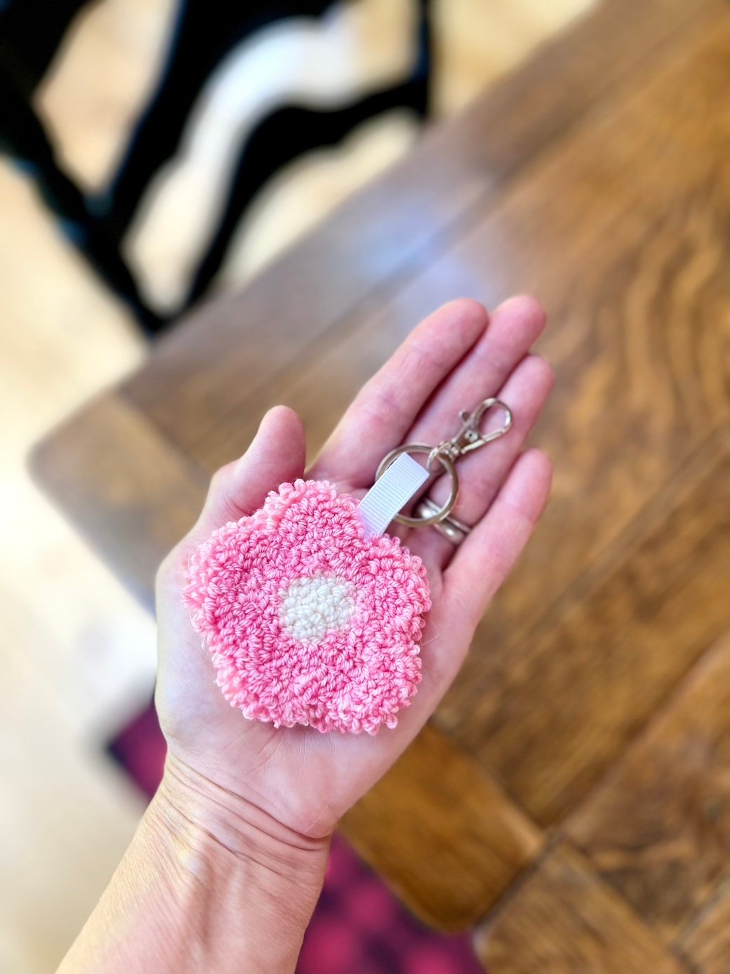 This hand-crocheted tufted flower keyring is designed to add a small, tactile detail to your everyday essentials. The plush, textured stitches give it a cozy, almost vintage feel, while the soft pink petals and cream center keep it light and feminine without being overly bright.