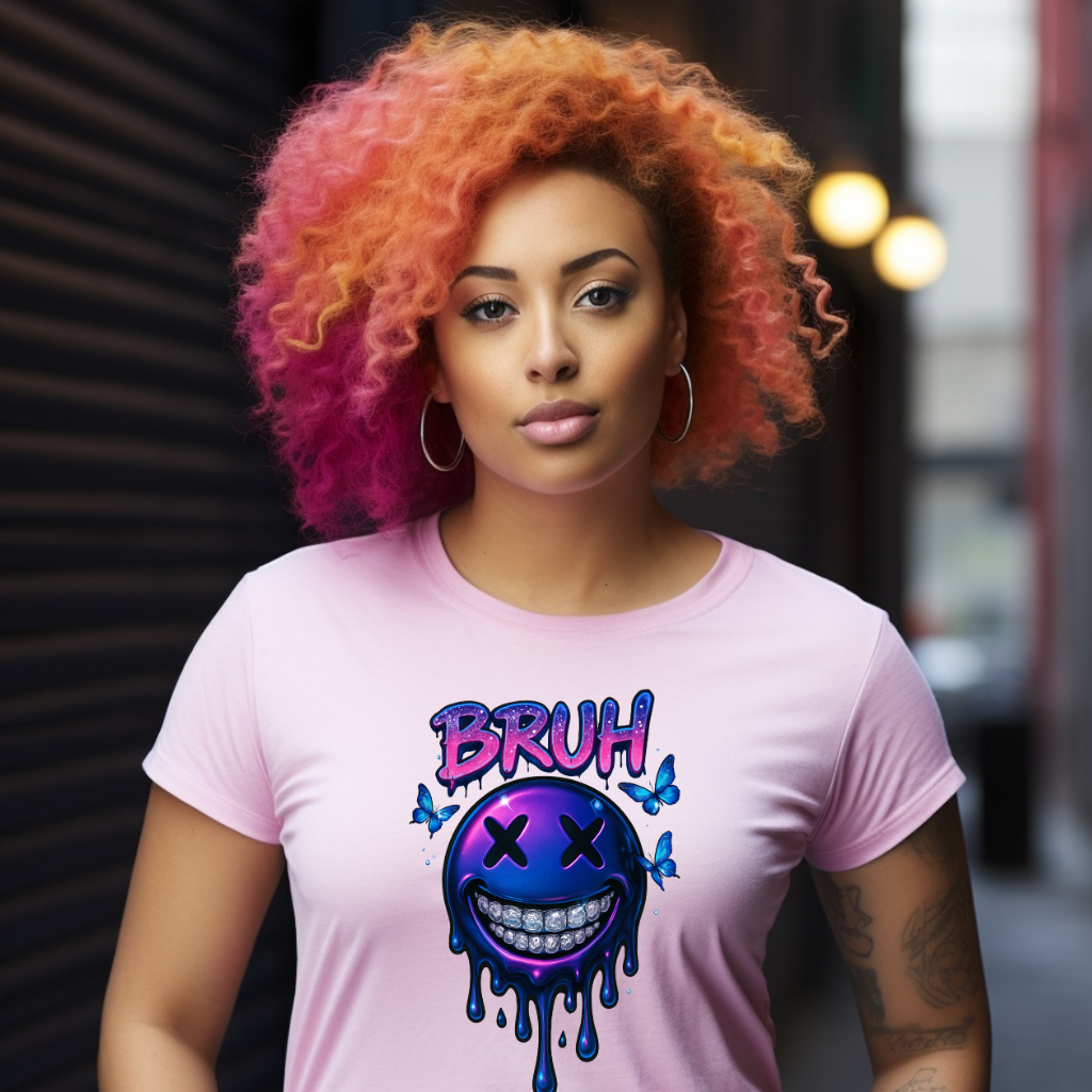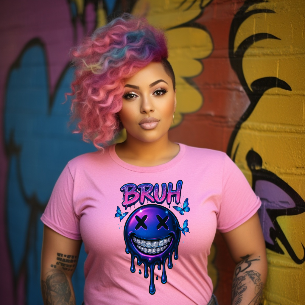 This bold, drippy BRUH design brings the vibe and the drama—a melting smiley face with icy grillz, surrounded by blue butterflies and gradient graffiti text. Perfect for T-shirts, hoodies, tumblers, or digital streetwear projects that need some serious attitude!