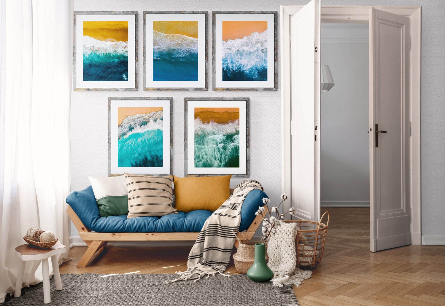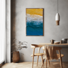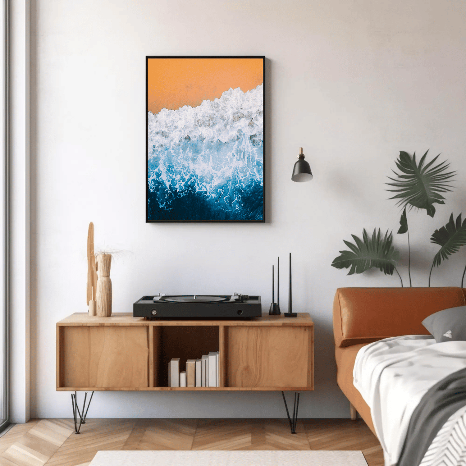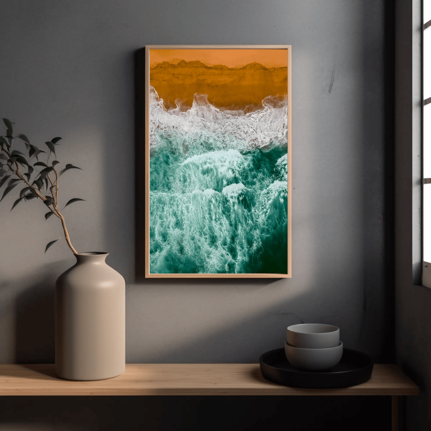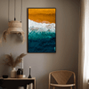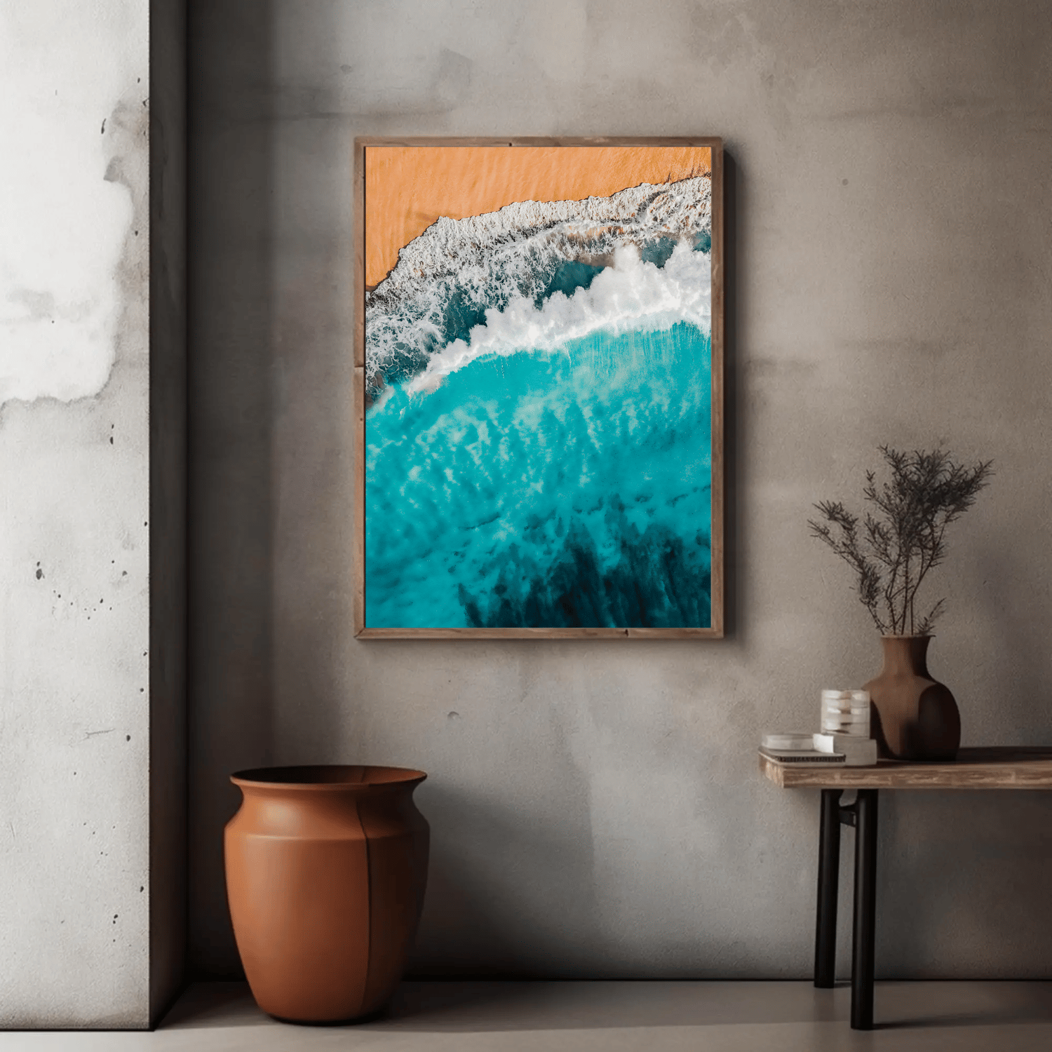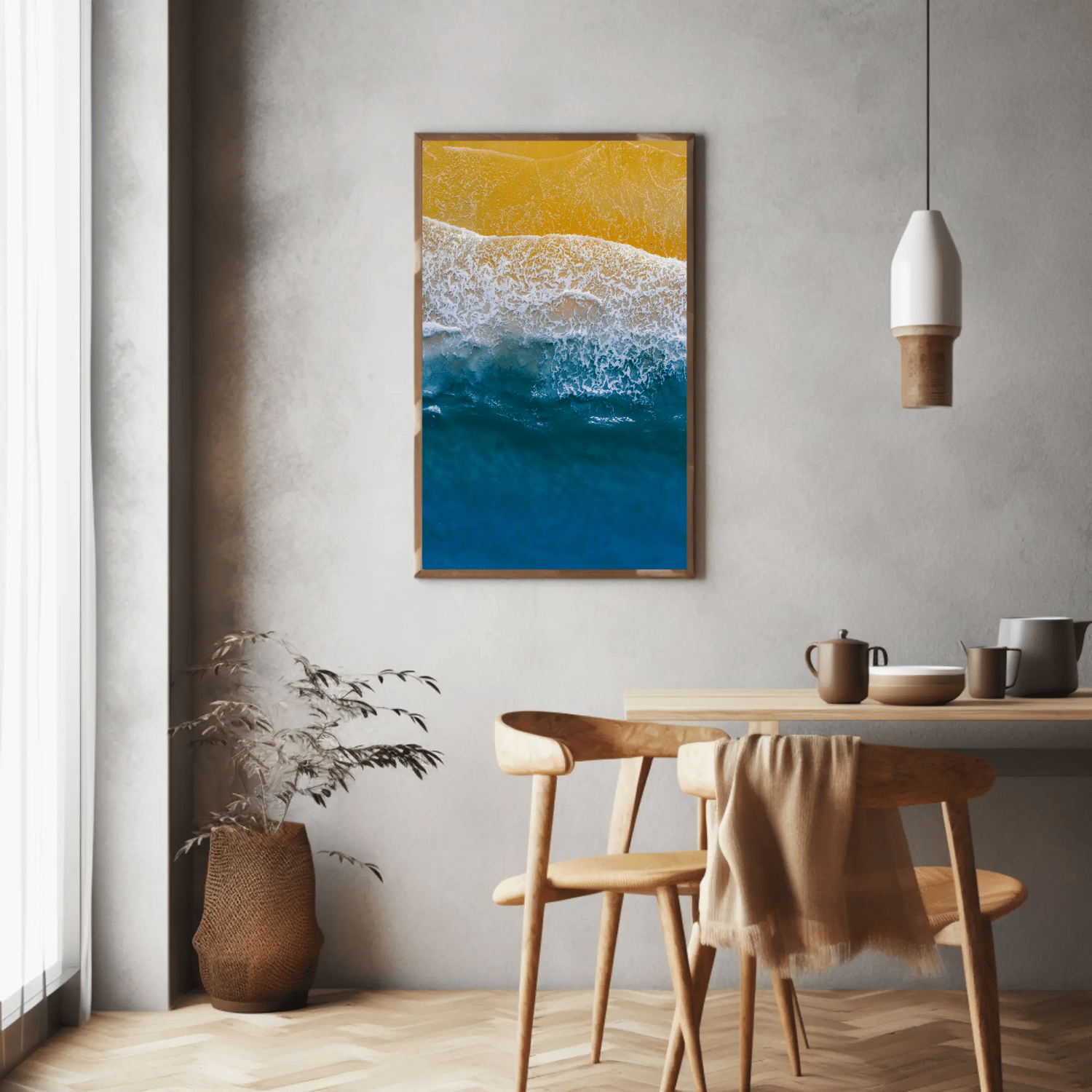 The aerial perspective captured in this artwork provides a sense of depth and dimension, immersing you in the vastness of the ocean. The tranquil blue hues of the water seamlessly blend with the ethereal sky, creating a harmonious and soothing ambiance that instantly elevates any room's aesthetic.