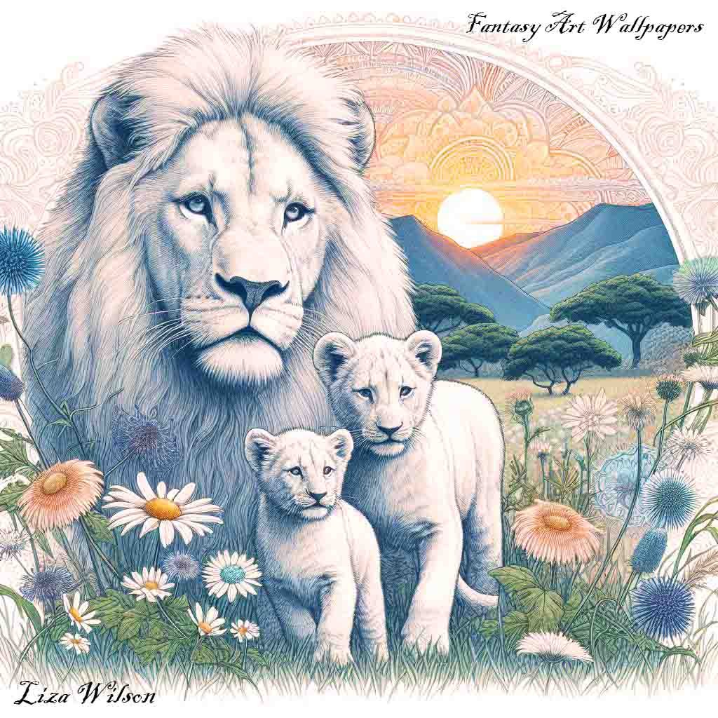 White lions and cub with flowers, trees and mountains. The sun is setting in the background.