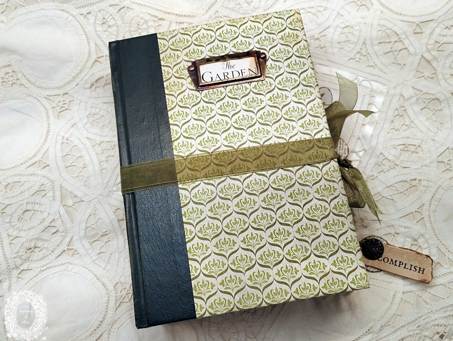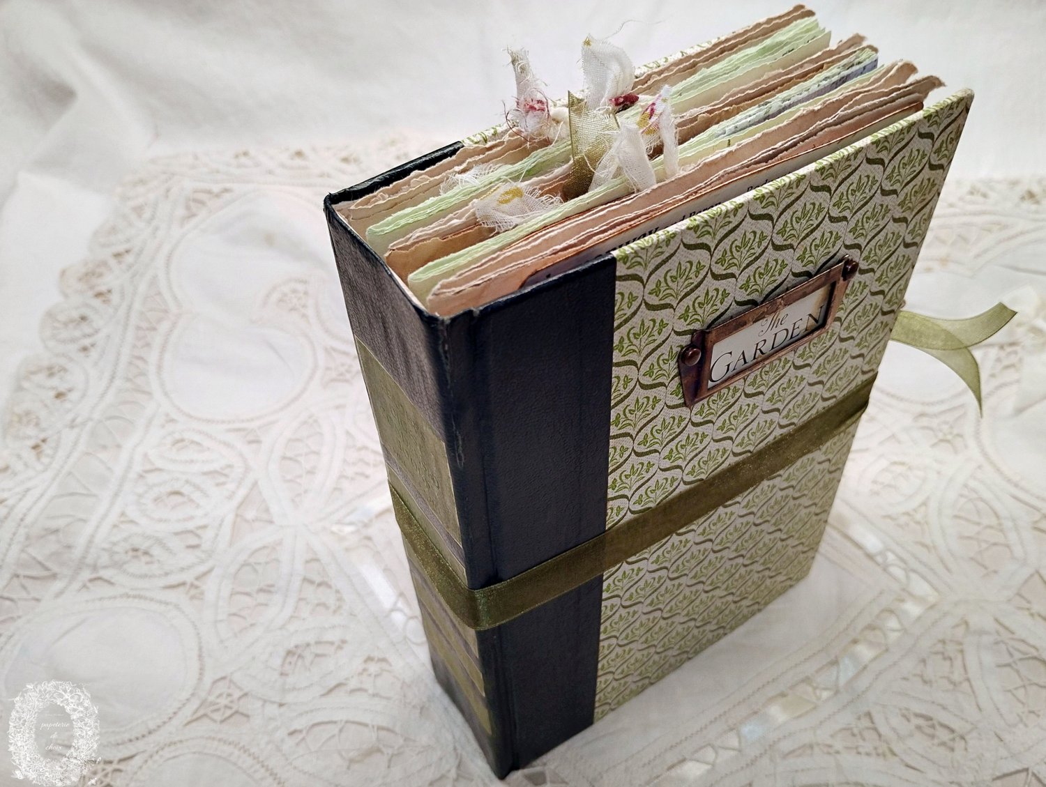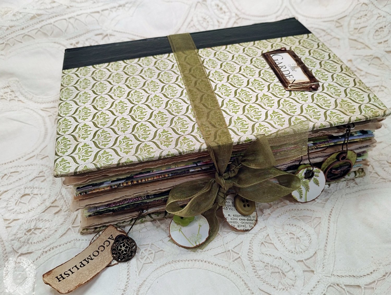 The Garden has 124 pages, 61 pockects/tucks, 10 special ephemera, 14 tags, and 19 journaling cards, all included in 5 signatures. It measures 7.75 inches tall x 5.75 inches wide x 2 inches thick. The cover is an authentic vintage book in a beautigul green pattern.
