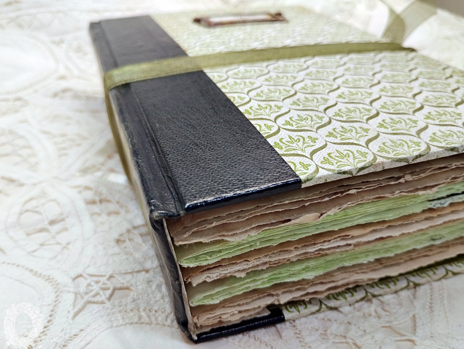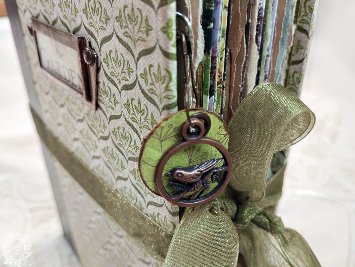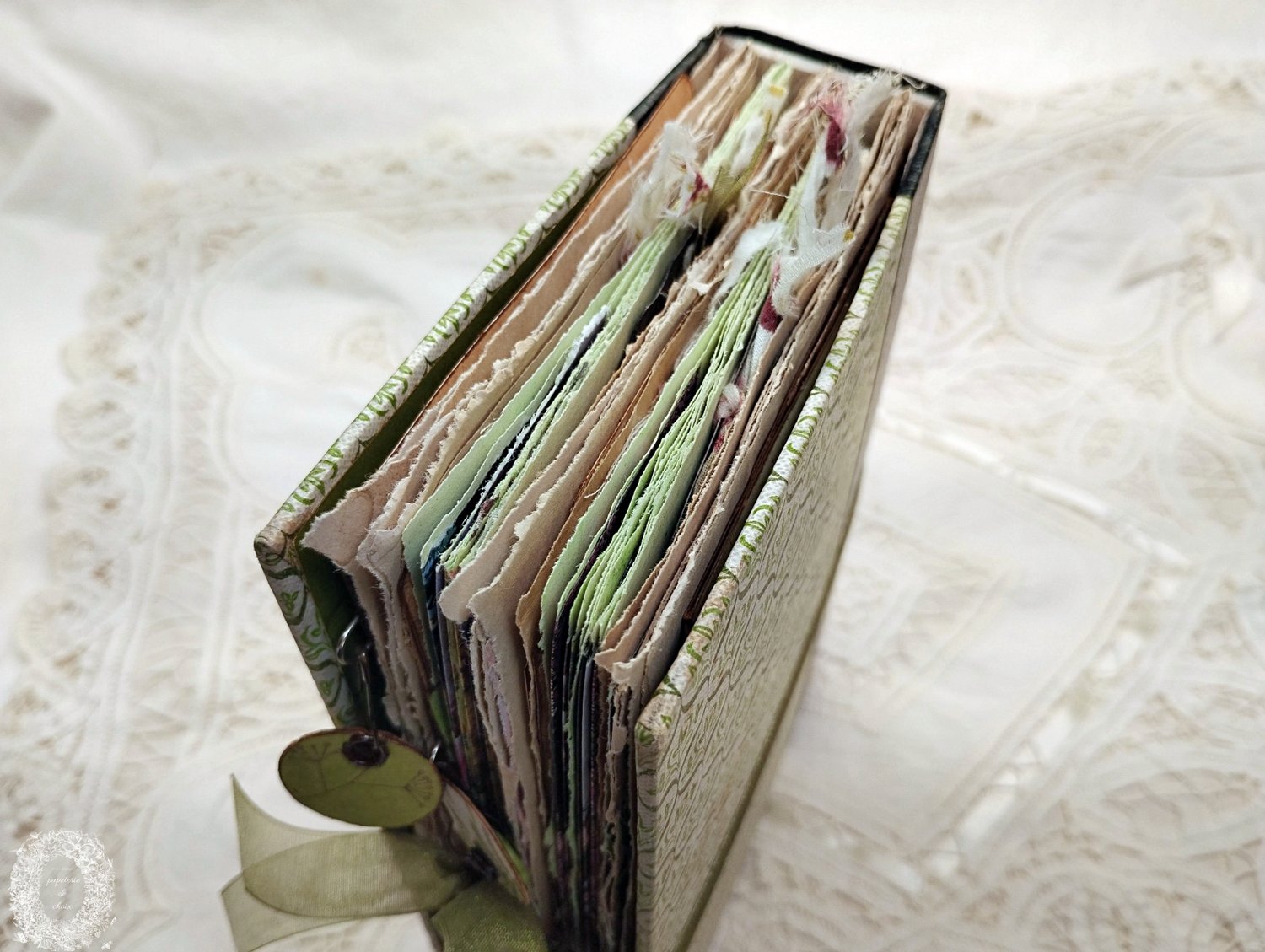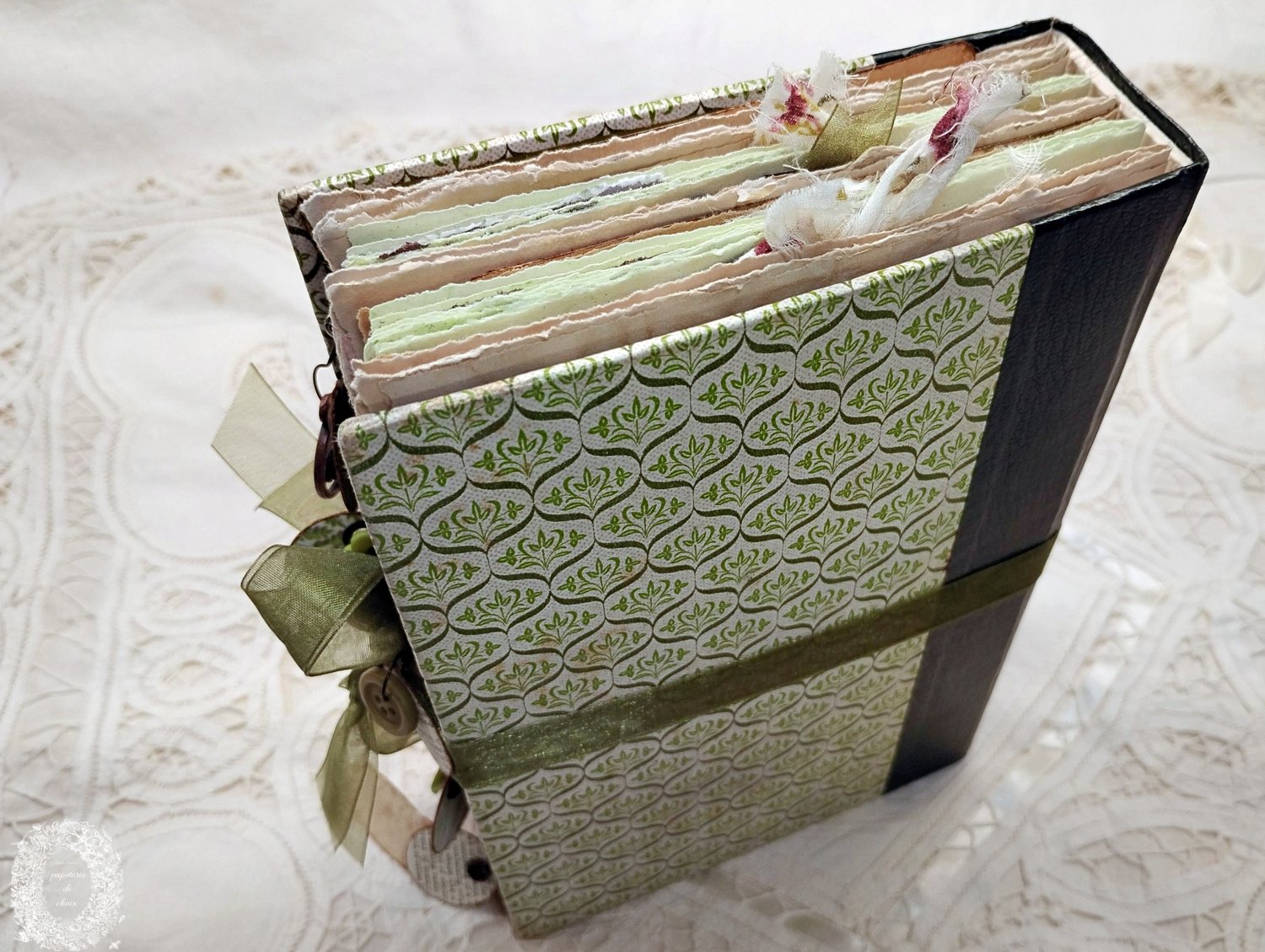 The Garden has 124 pages, 61 pockects/tucks, 10 special ephemera, 14 tags, and 19 journaling cards, all included in 5 signatures. It measures 7.75 inches tall x 5.75 inches wide x 2 inches thick. The cover is an authentic vintage book in a beautigul green pattern.