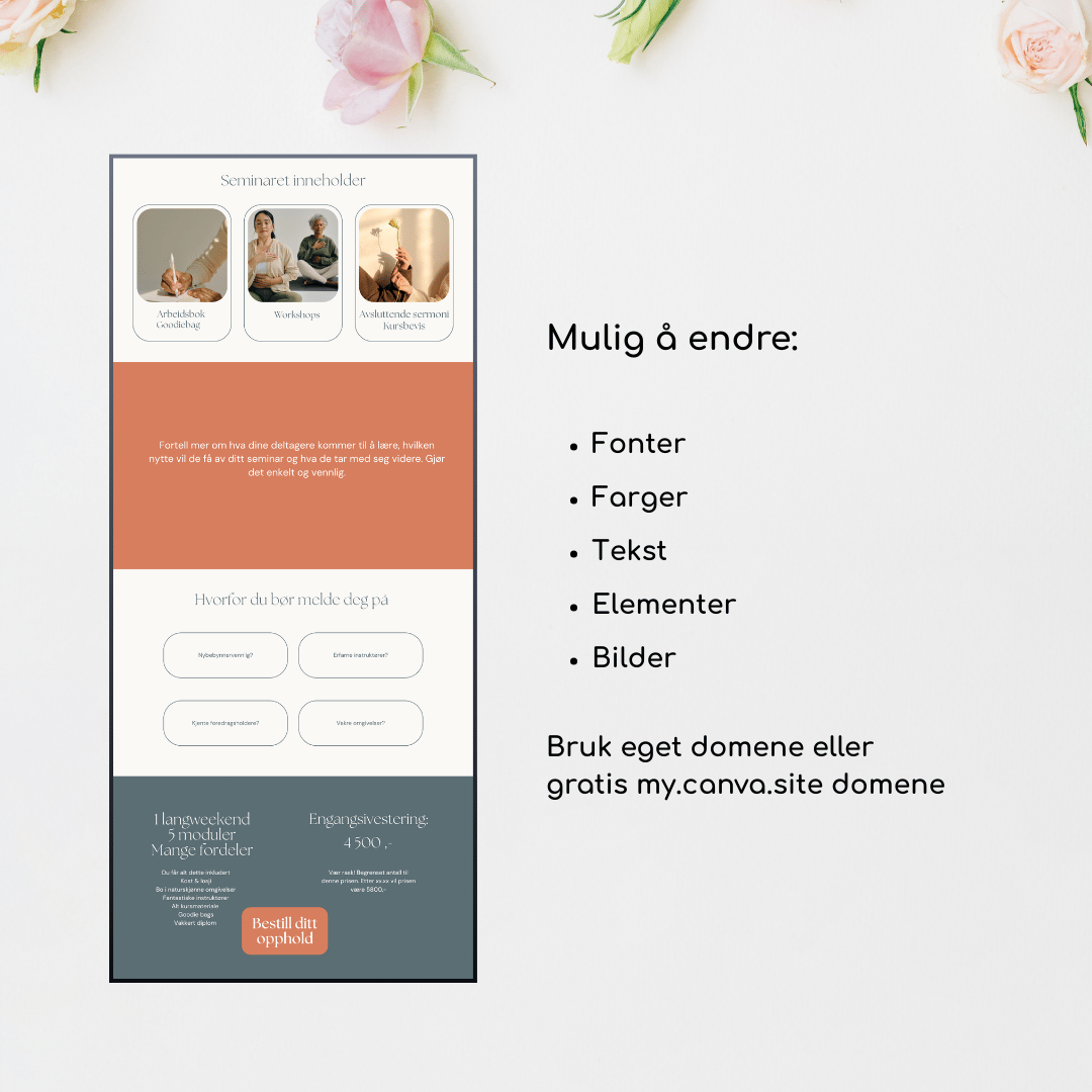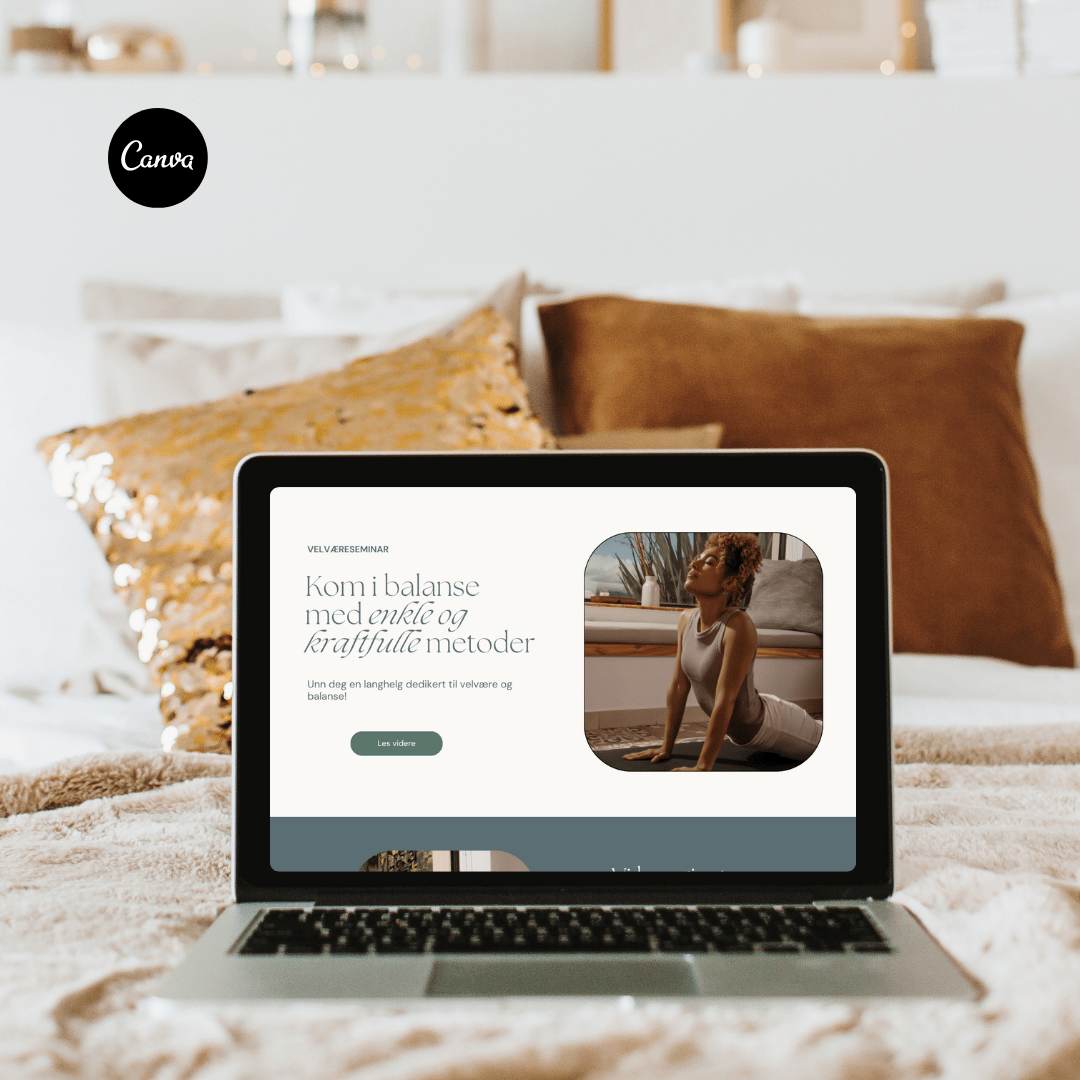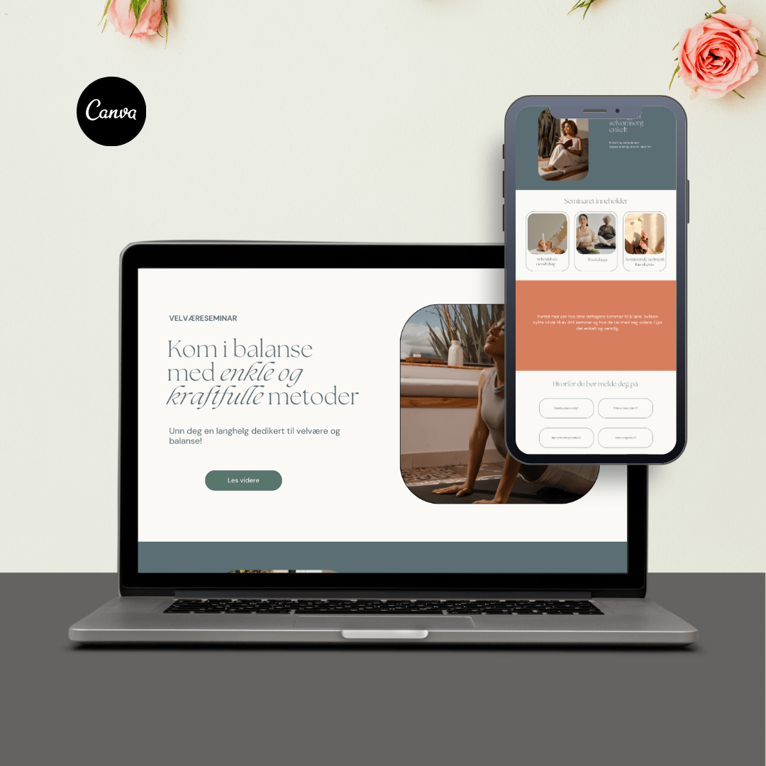 Harmonisk Canva landingsside mal i Canva perfekt for wellness weekend seminar - tilpasset og laget med naturlige farger og myke fonter. Tilpass ditt behov med å endre tekst, farger, fonter og elementer etter egen smak. Perfekt for kurs, nettkurs, seminarer og lignende.