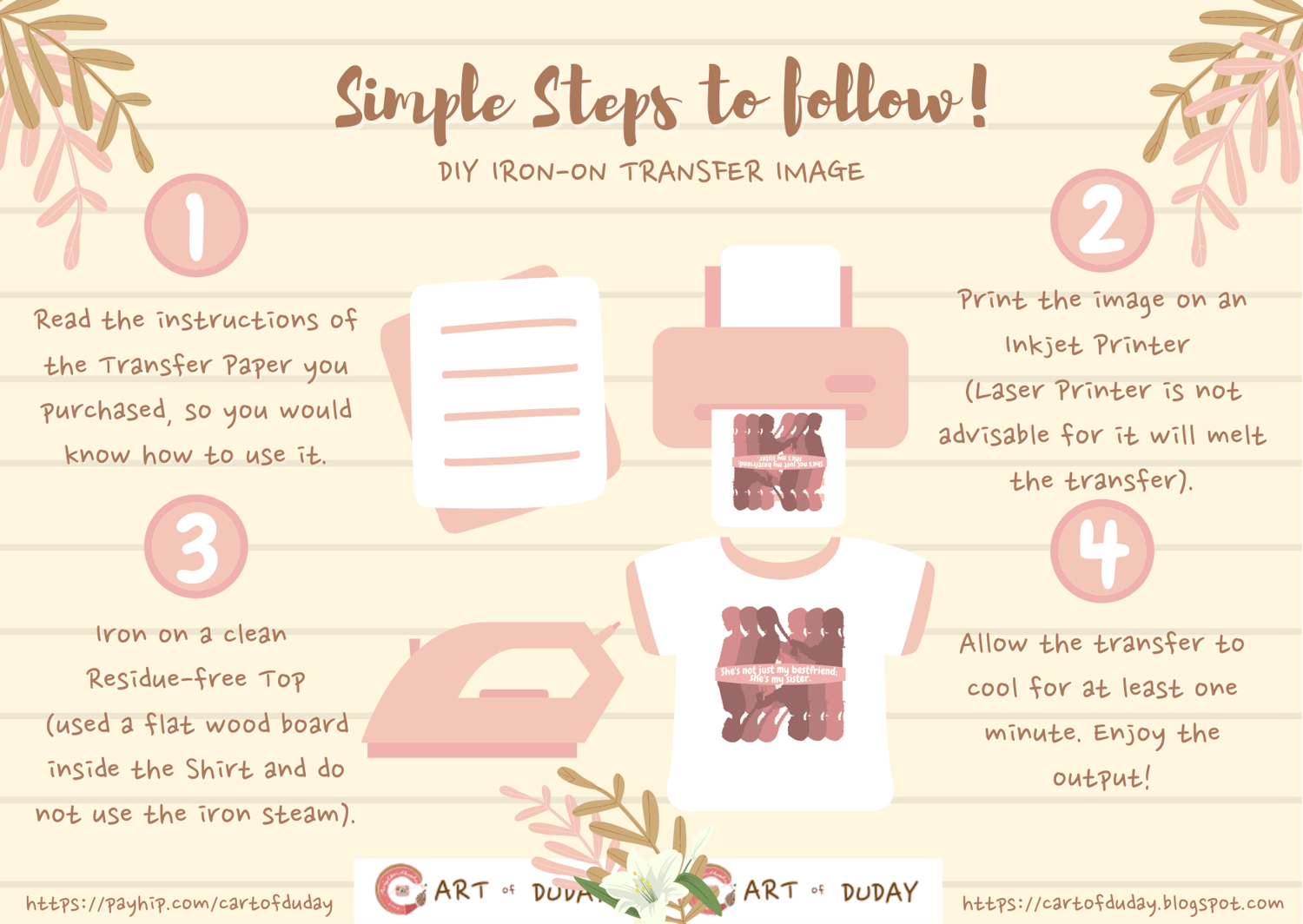 ***Please read and follow the instructions on the Transfer paper you purchased, so you would know how to do your transfer and your printing, so as what image type you need to use. Refer first to a lot of tutorials across the web like YouTube if you're not so sure on how to do it. Once you’re done with your printing, don’t forget to cut out or trim the edges of the design before ironing.