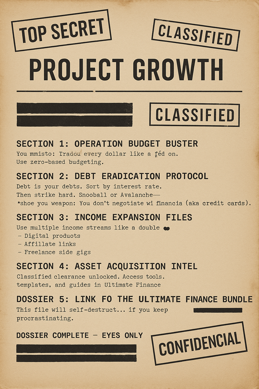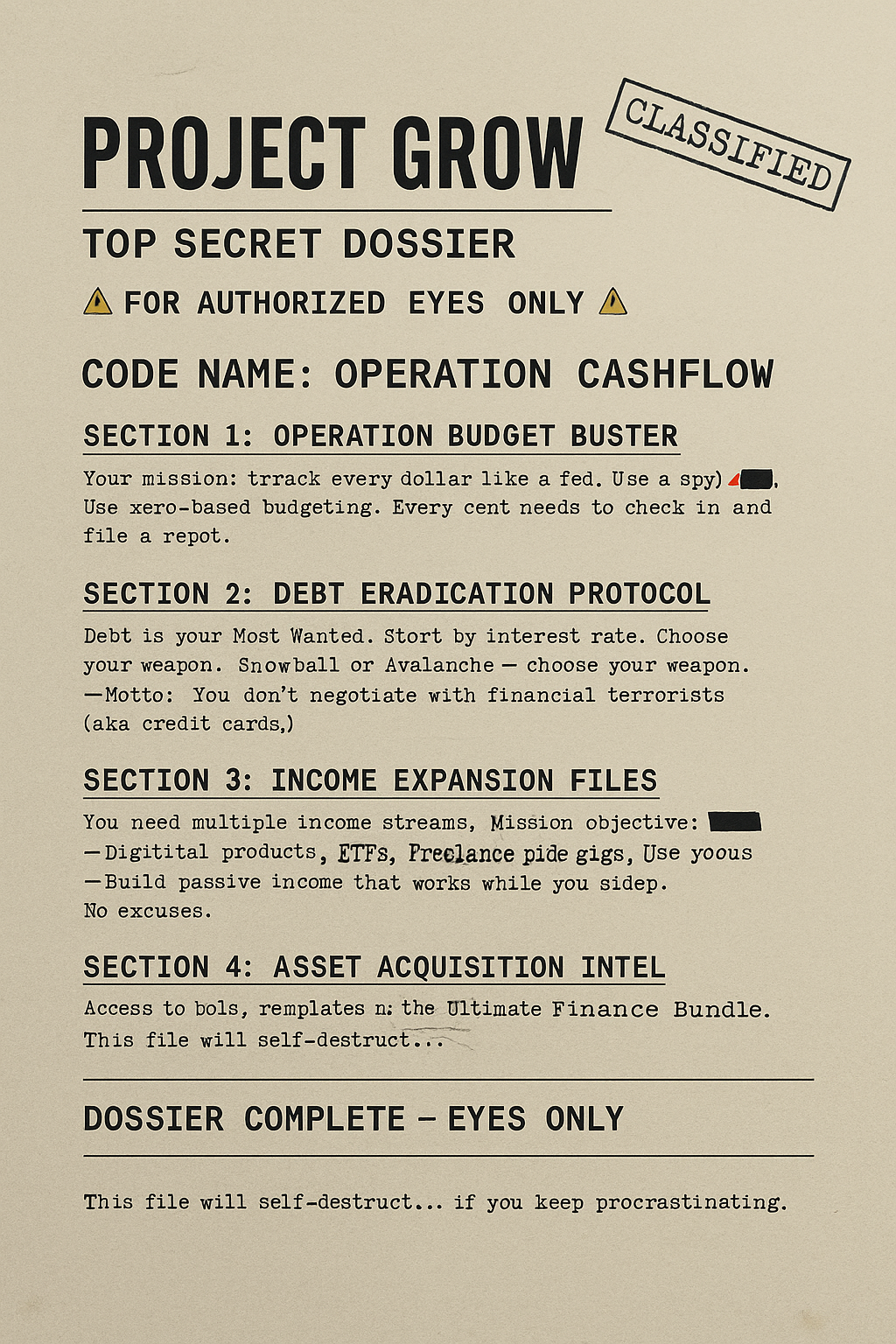 This editable 2-page finance template kit is your Top Secret mission to budgeting smarter, killing off debt, and unlocking new income streams. Designed like a classified government file, this witty, fillable planner turns boring finances into a high-stakes operation.