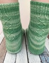 The serpentine socks are a fun interpretation of one of nature’s most interesting (or scary!) creatures. This top down sock features a cute snake sticking out it’s tongue on the front of the sock and has a cabled shadow snake down the back of the leg. Cabling usually pulls in a little, so this sock features 1 by 1 ribbing down the back of the leg for a perfect fit.