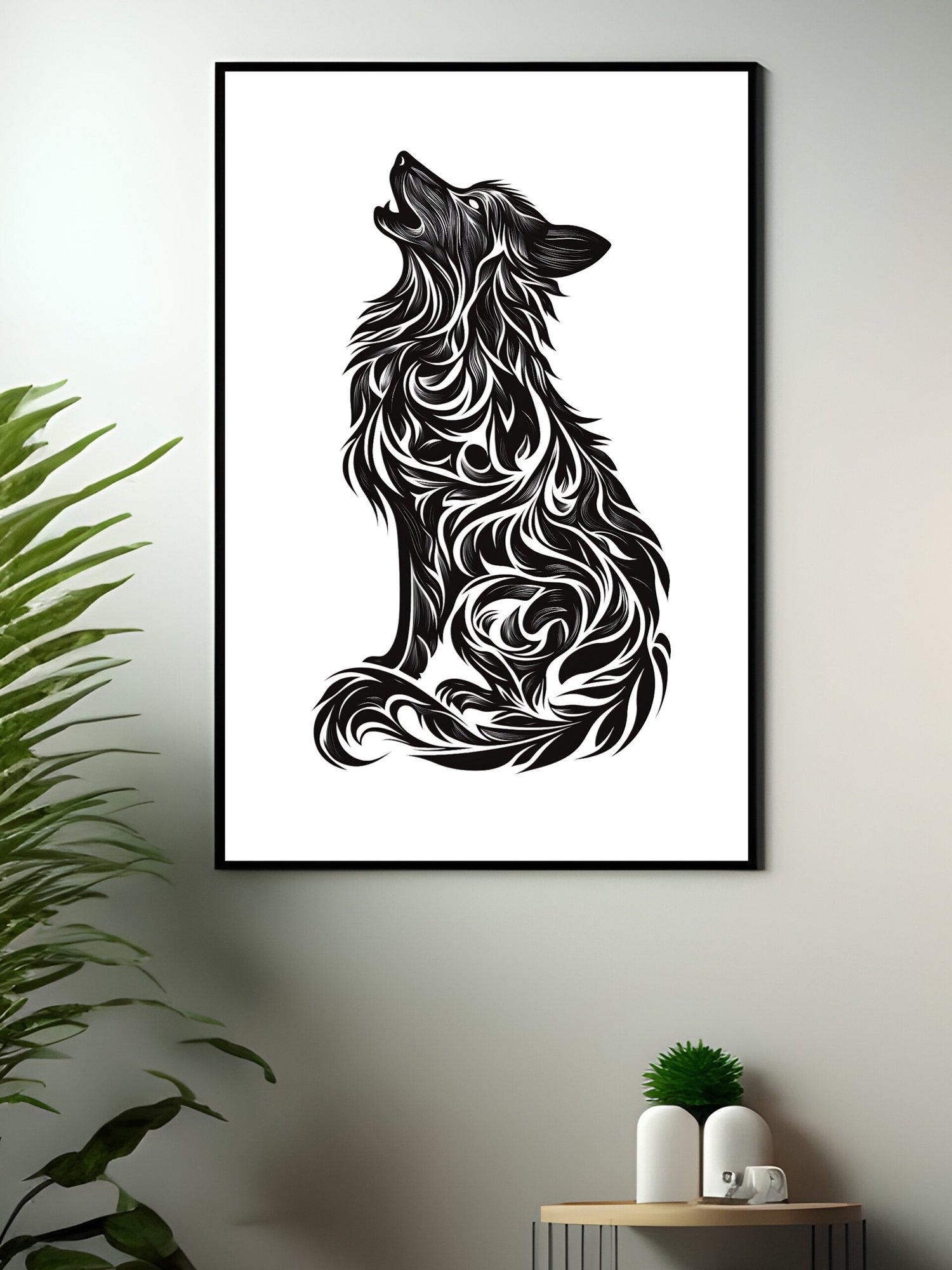 Bold, elegant, and quietly powerful, this black-and-white wolf art print brings a sense of wild beauty and calm confidence to any space. The wolf is illustrated through flowing, intricate lines that create a striking silhouette—each curve adding movement, texture, and depth. The minimalist color palette keeps the piece timeless while allowing the detailed design to stand out.