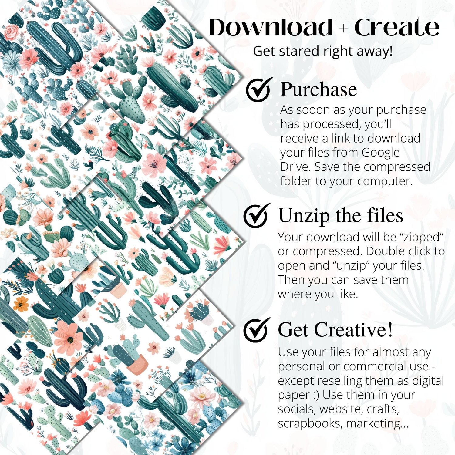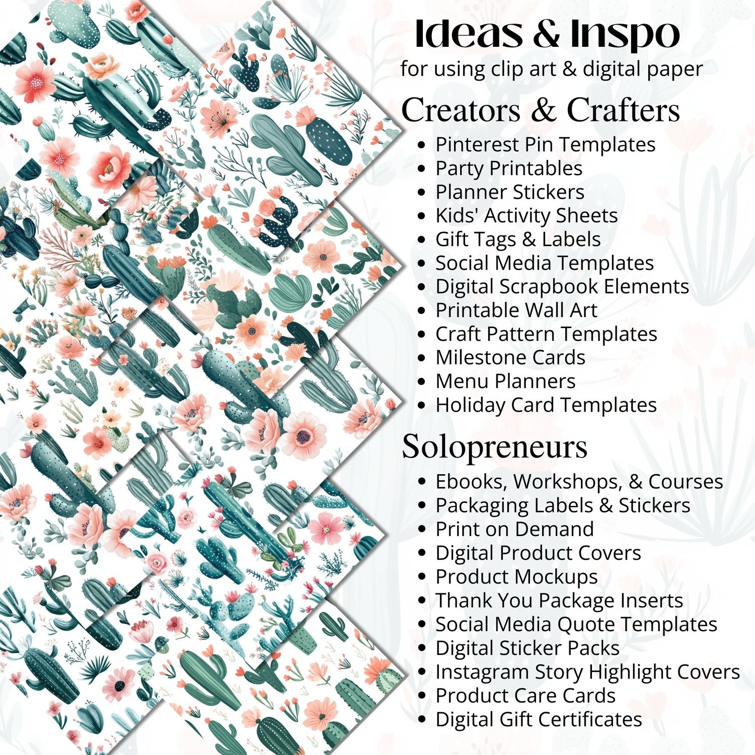 Use them to create scrapbook pages, planner spreads, invitations, product packaging, or social media graphics. The soft pink florals and green cactus illustrations add a playful, boho vibe to any creative project. Compatible with Canva, Photoshop, Procreate, and more.
