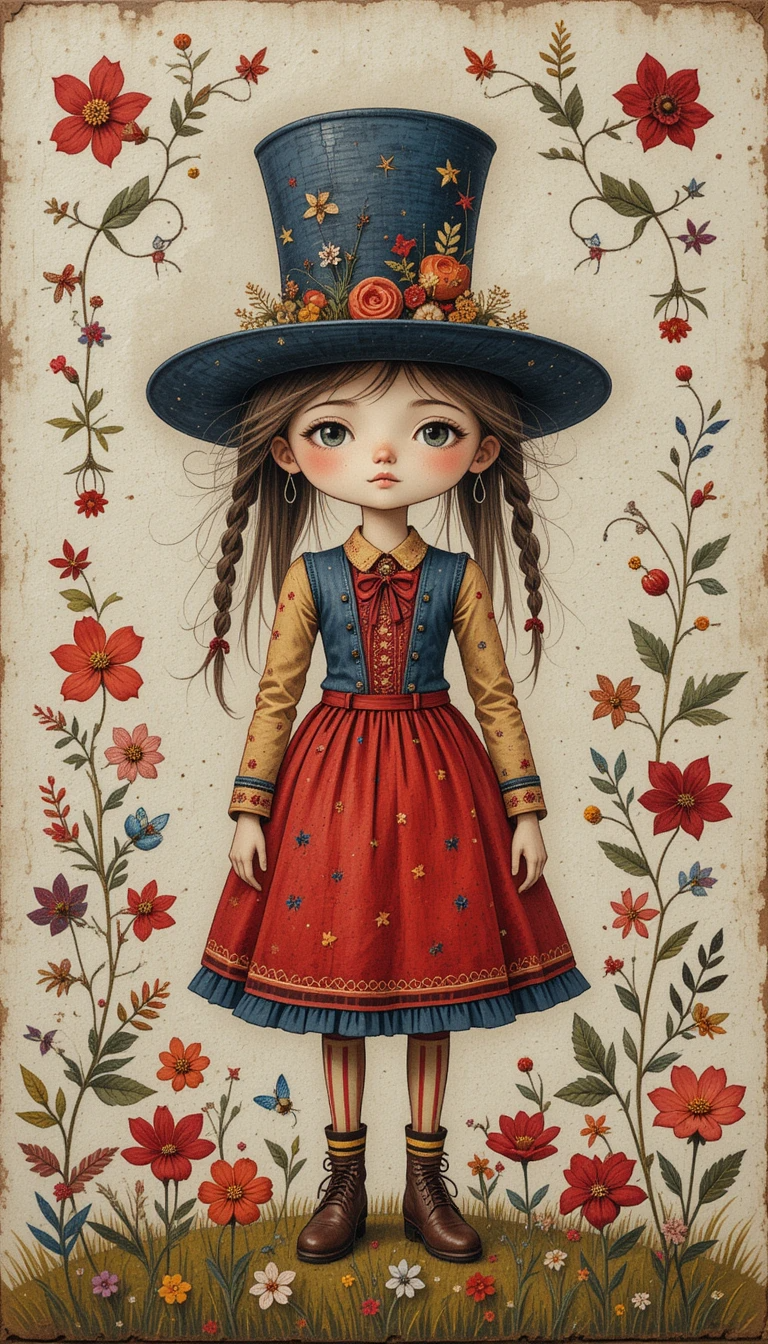2 cross stitch patterns of the little Folk Girl on a light coffee background for both DMC and Anchor cottons.
